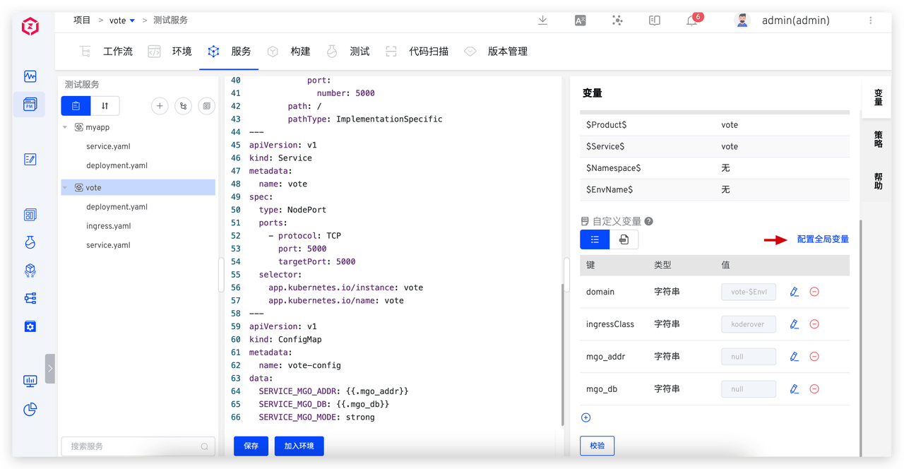 为业务入口配置外网访问地址,在 Zadig 中配置全局变量:{{.domain}},变量值设为:vote-$EnvName$.koderover.com