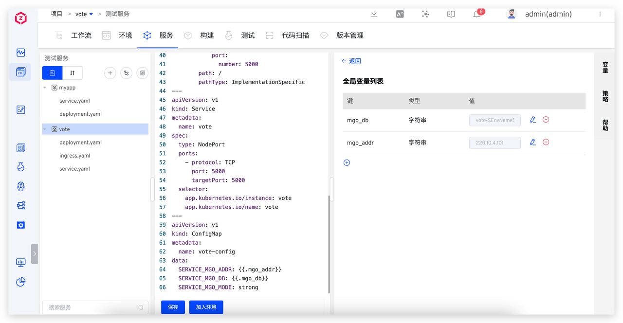 以 vote 服务为例,该服务的数据库配置管理在 ConfigMap 中,并通过 volume 挂载到应用中。在 Zadig 中,我们将数据库配置项抽取为自定义变量: