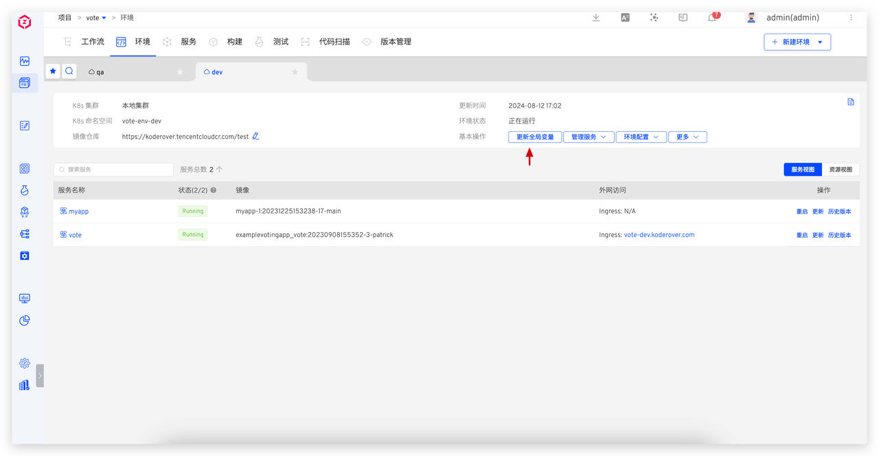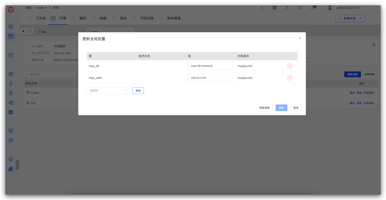 环境中全局变量的值可以被修改。一旦全局变量发生变更,所有依赖这些变量的服务将自动同步更新,确保配置的一致性和实时性: