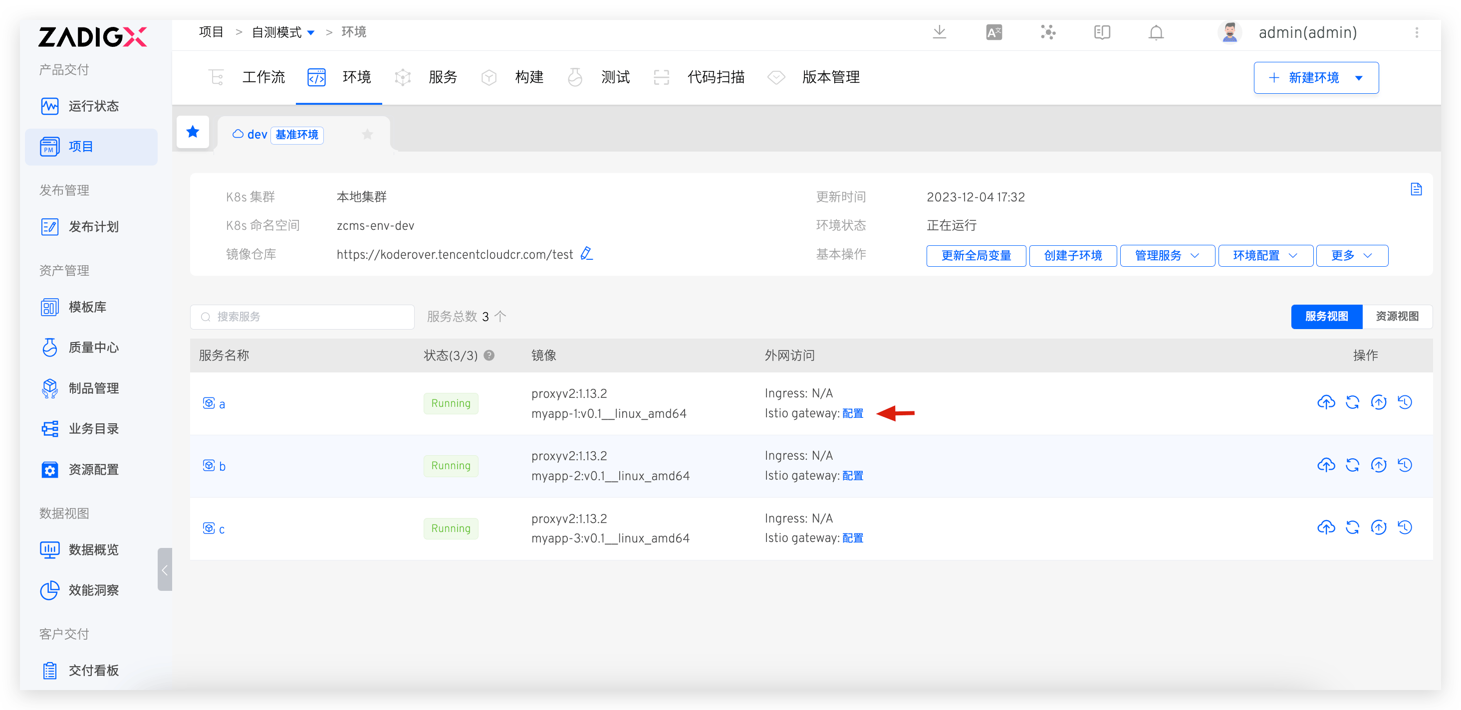 在 dev 基准环境中点击创建子环境,选择 a 服务可创建包含 a 服务的子环境 dev-test-env1: