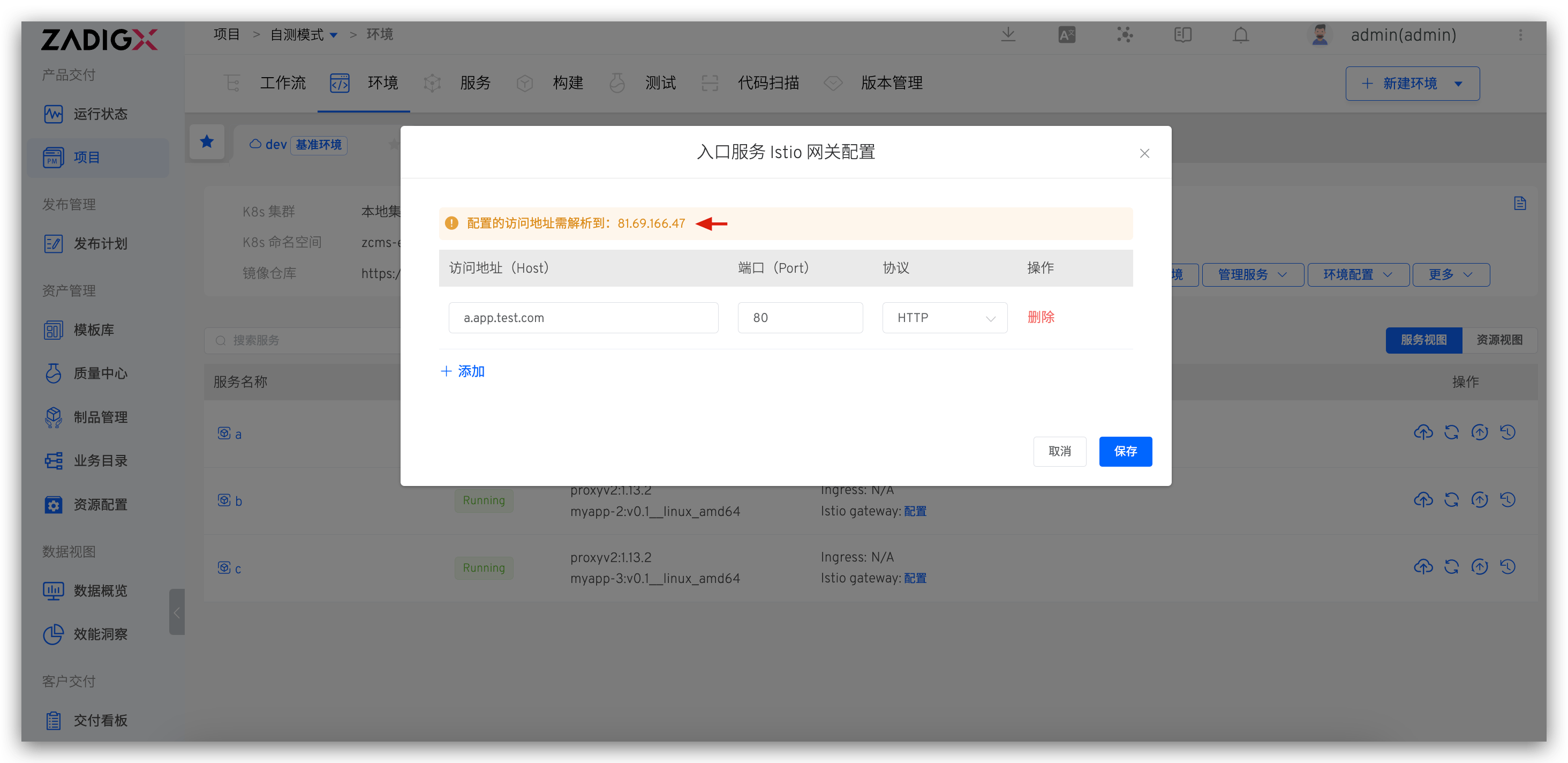 若子环境中包含入口服务,则需要配置基准环境入口服务的 Istio 网关。需要将配置的访问地址解析到集群 istio-ingressgateway service 的外网访问地址上,如下图所示。