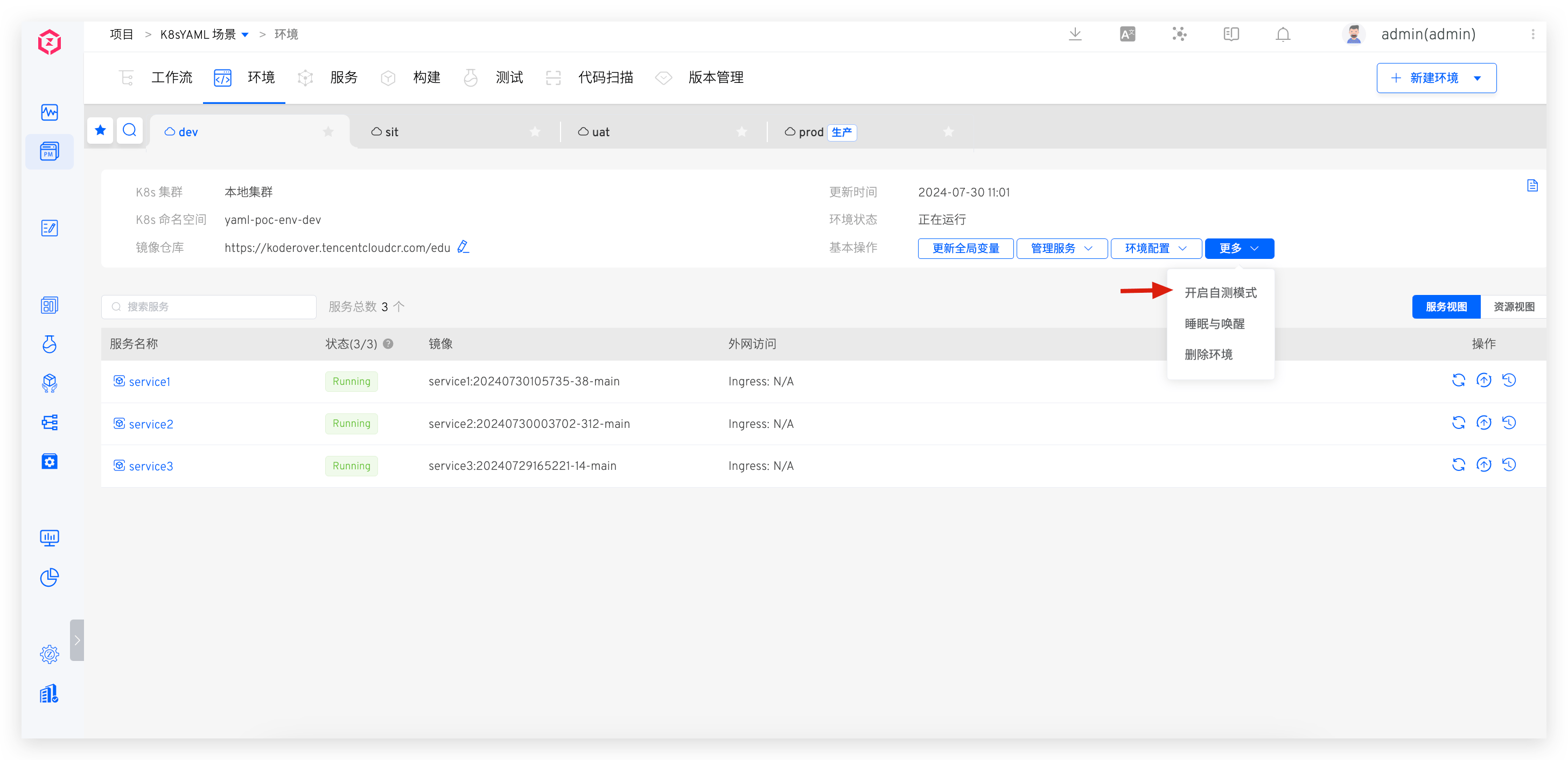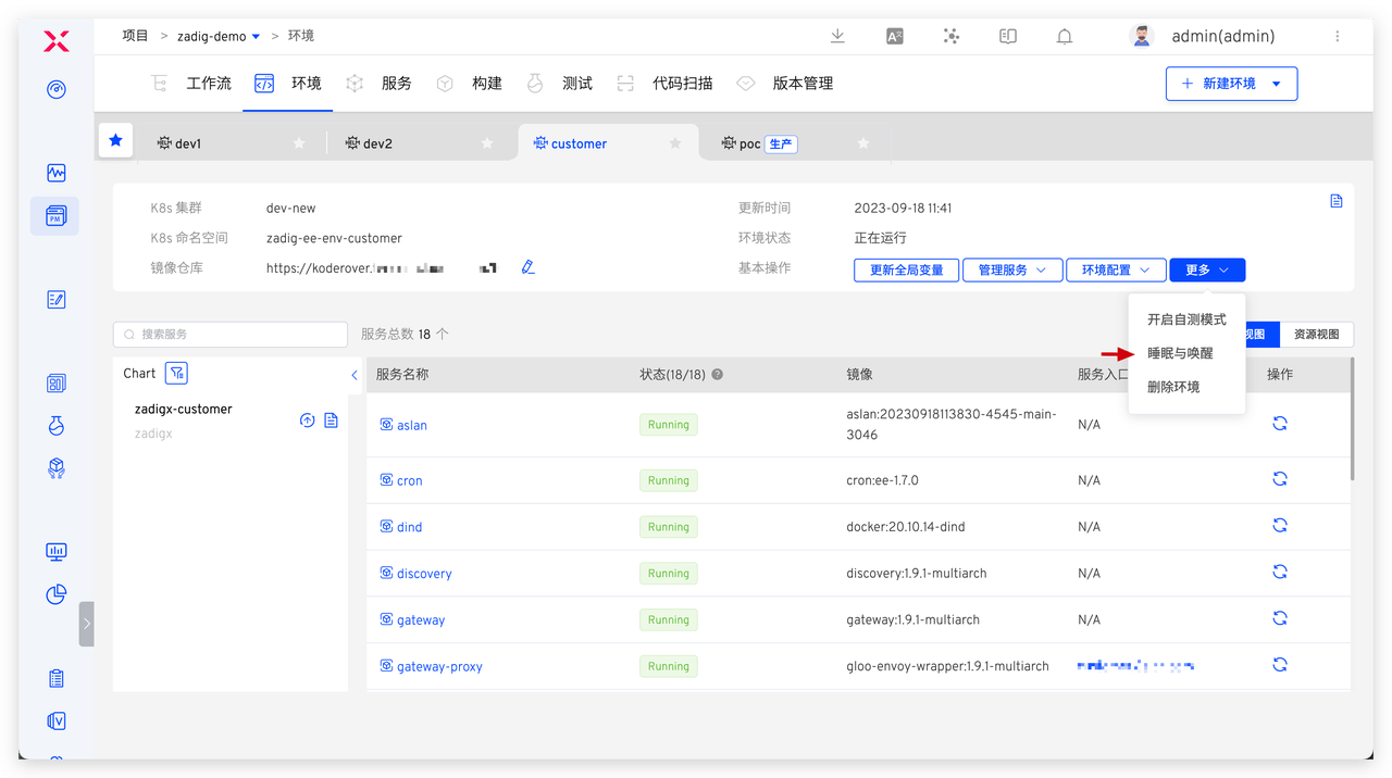 睡眠后,环境中所有服务实例副本数将会自动调整为 0,CronJob 会被挂起,节省环境所使用云资源成本。