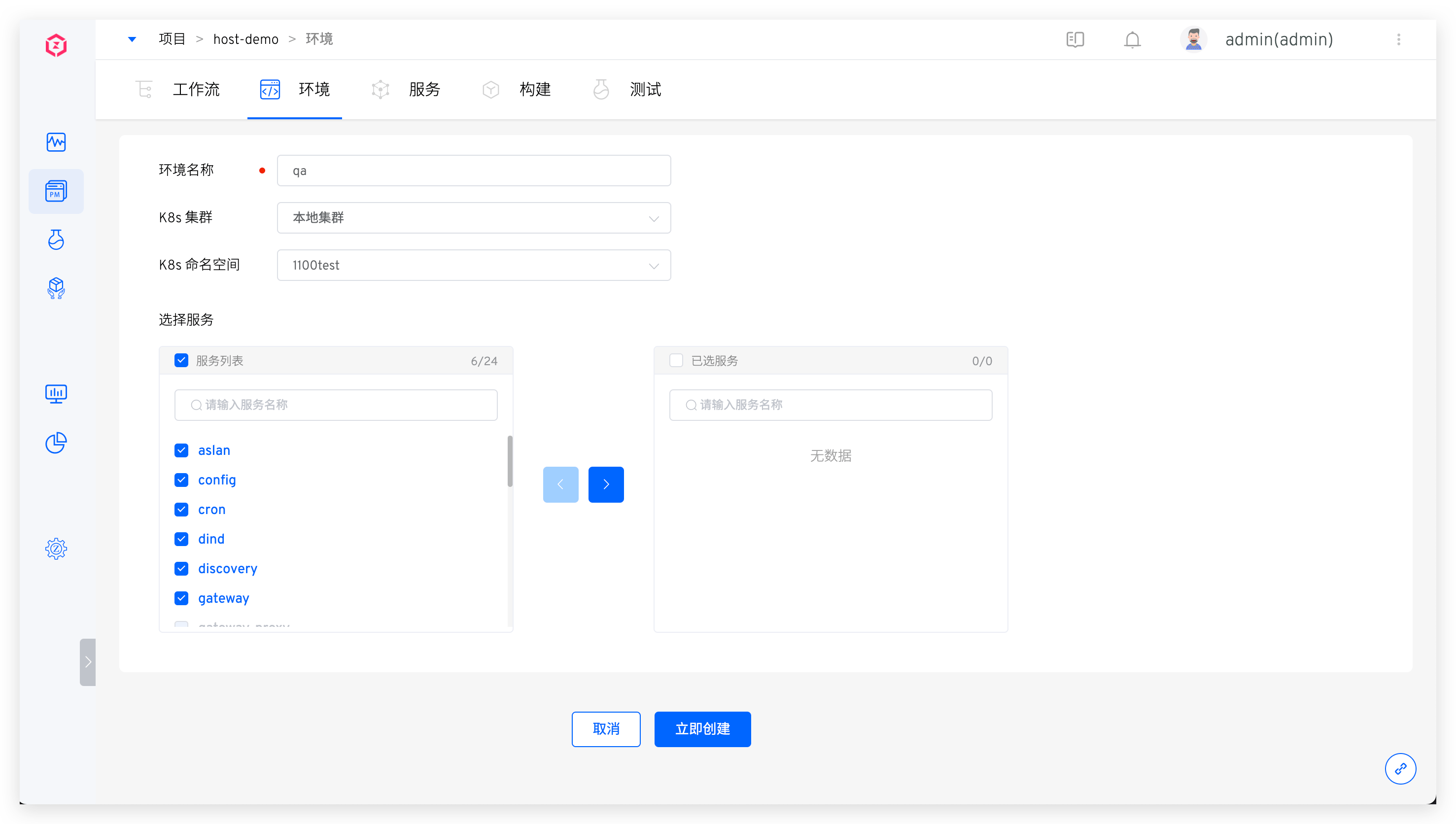 在 K8s 托管项目中点击新建环境按钮进入新建环境页面,填写相关参数后立即创建即可。