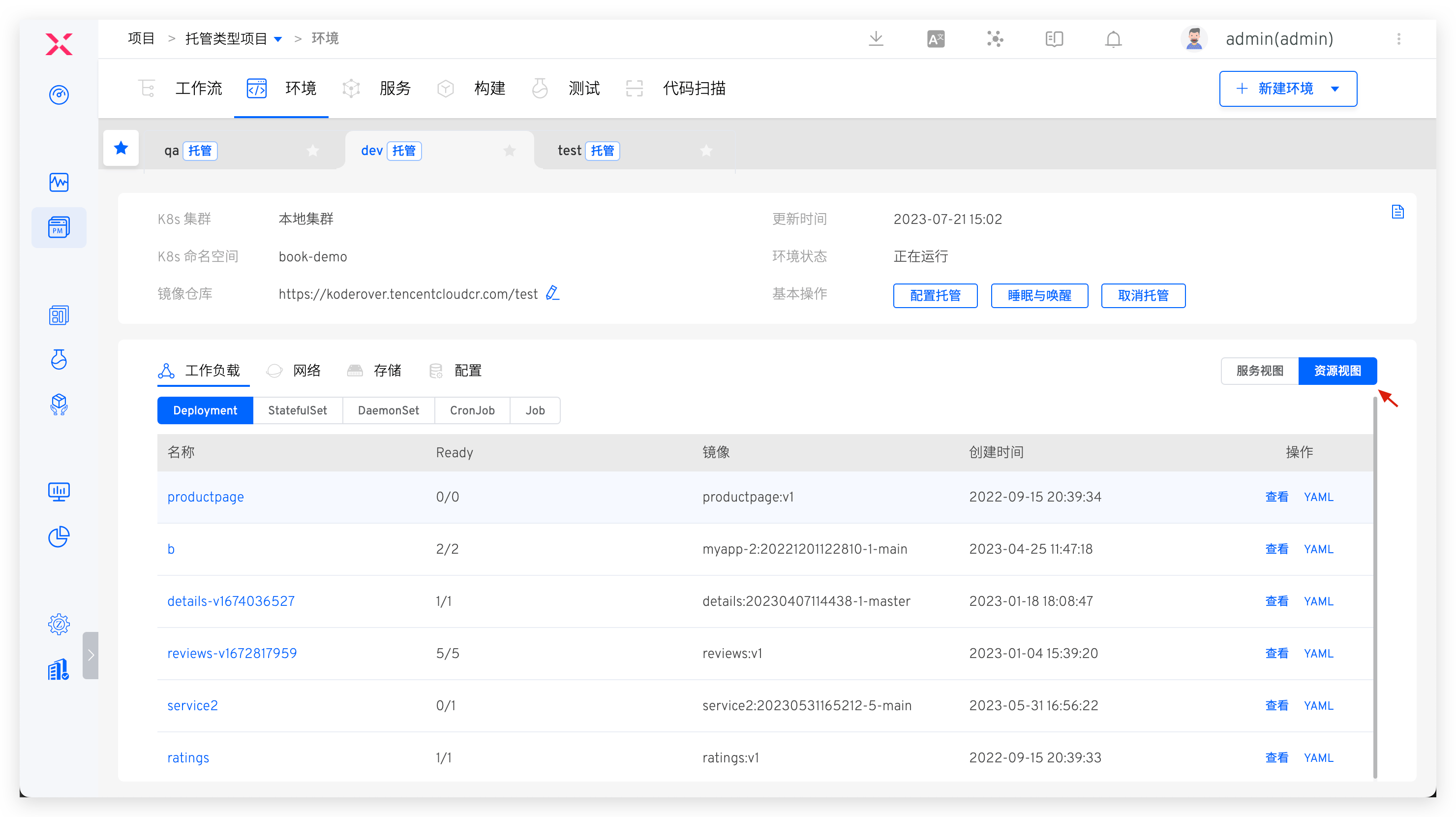 点击不同的环境 Tab 即可查看该环境及环境中被托管服务的详情,点击资源视图,可从工作负载/网络/存储/配置等资源视角对该环境所托管命名空间下的资源进行查看。