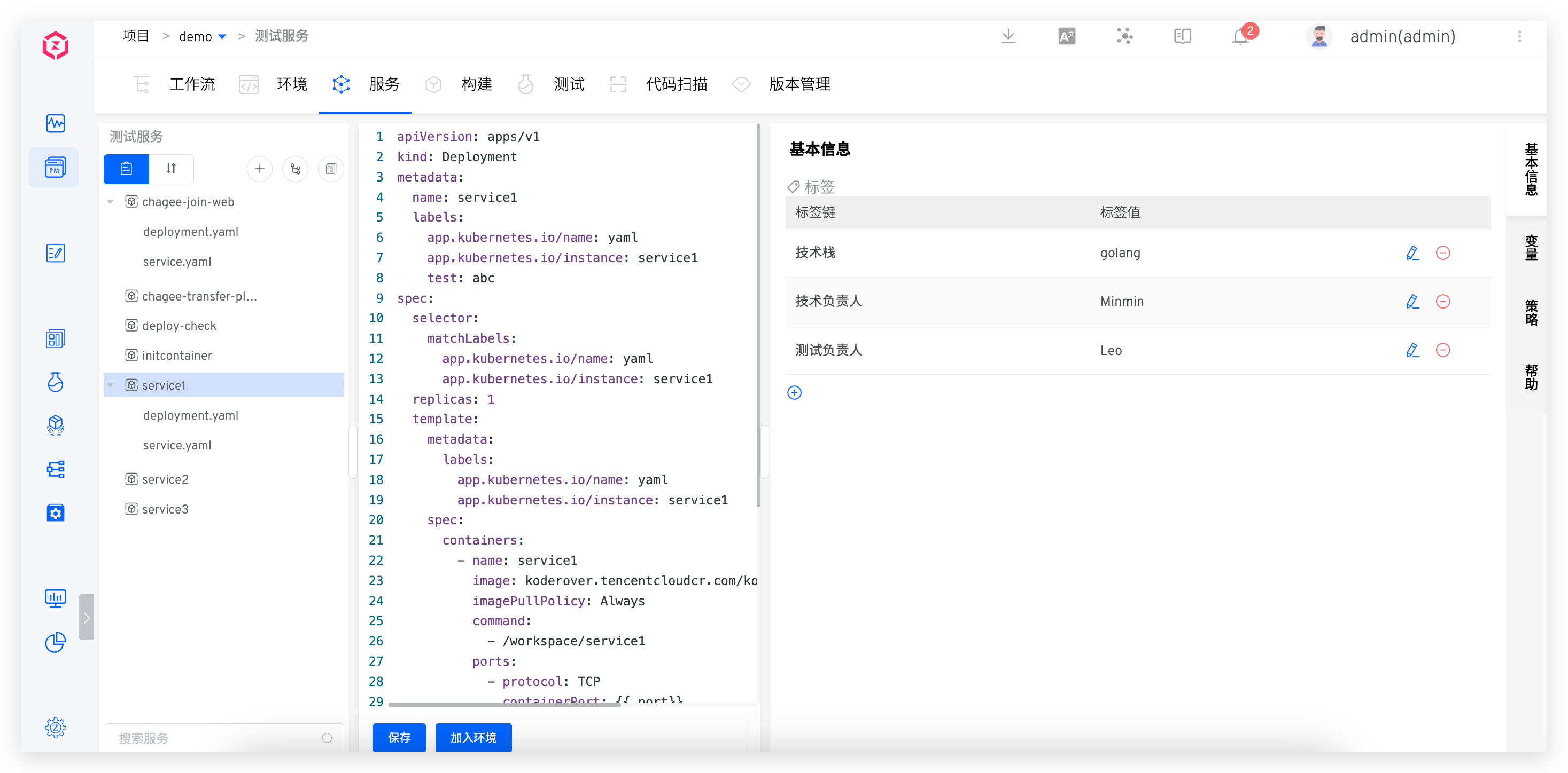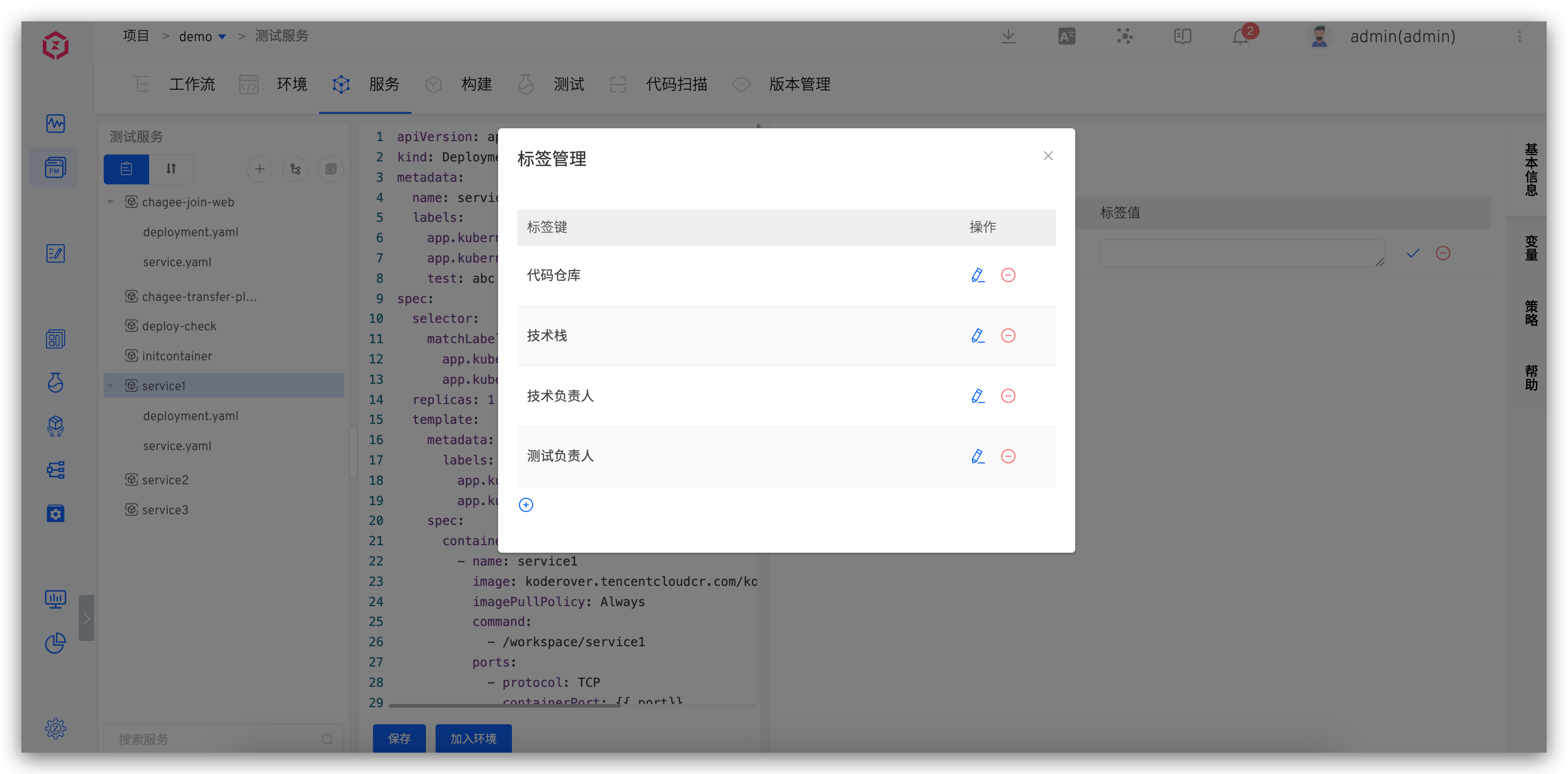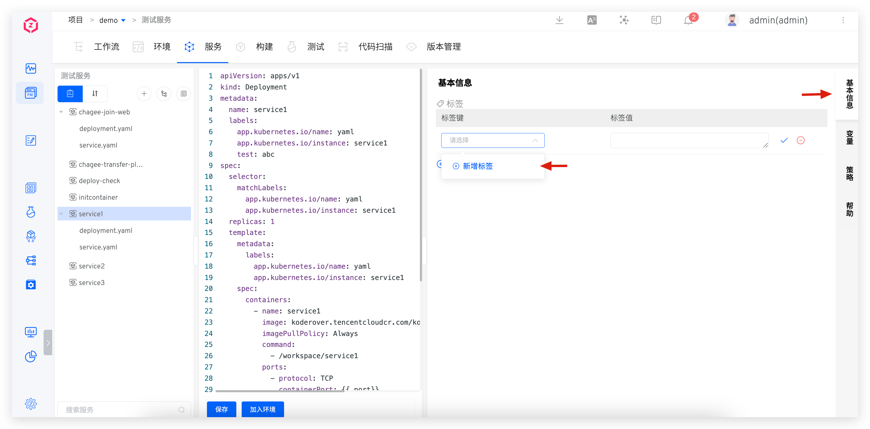 在 Zadig 上,可以轻松实现对服务标签的集中管理。进入「服务」页面,在「基本信息」区域添加相应的服务标签,即可为服务关联已有的标签,从而提升服务的分类和检索效率。