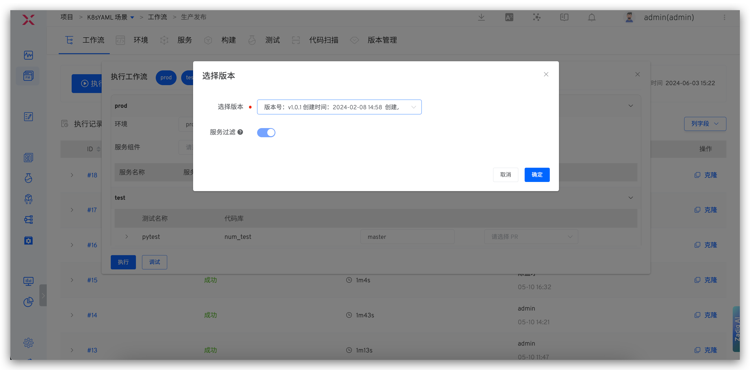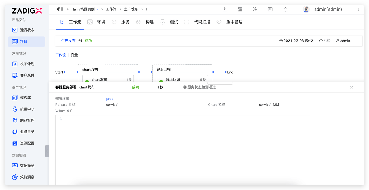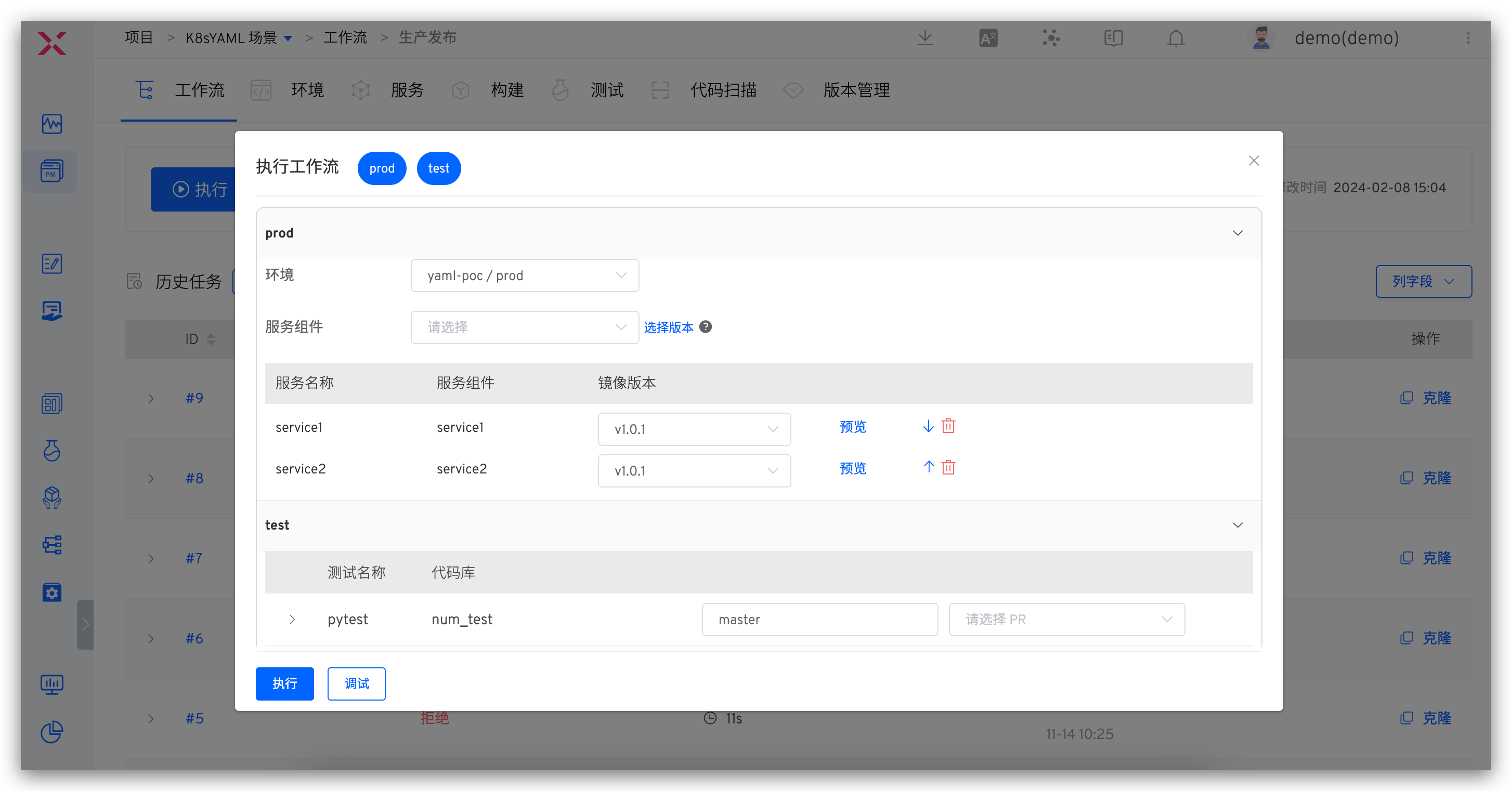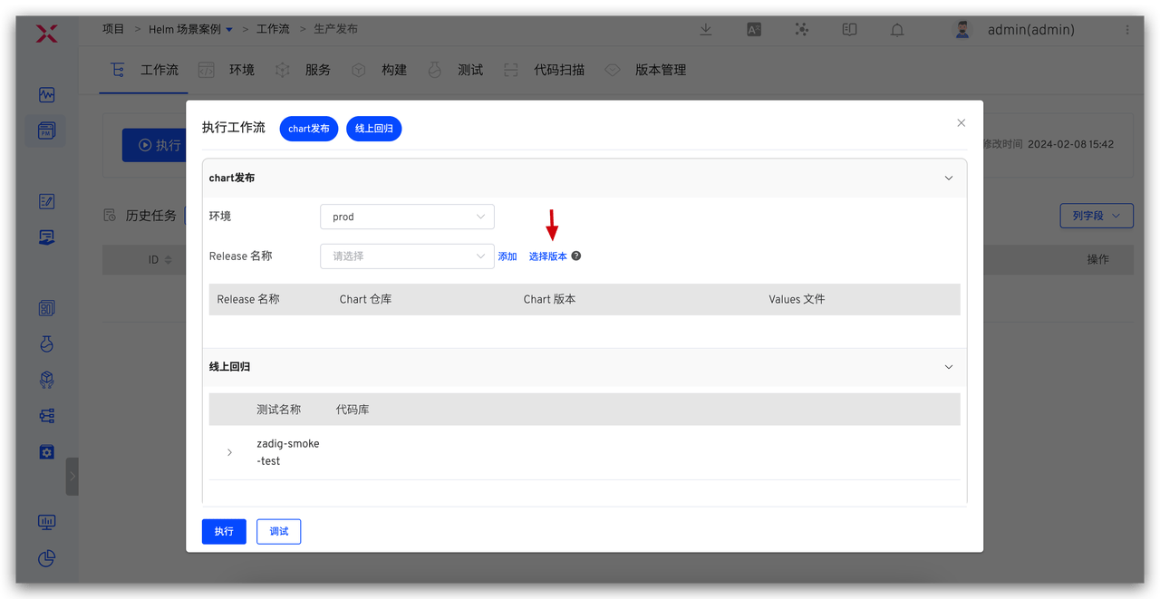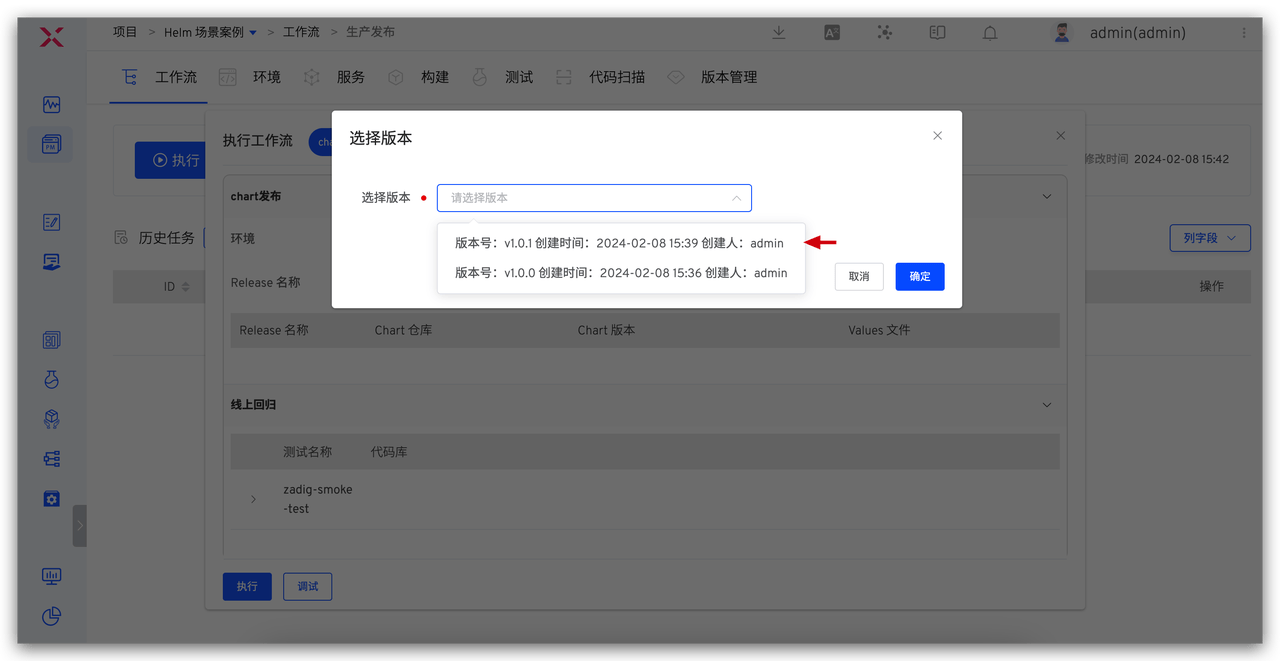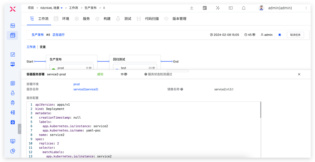 - 执行生产发布工作流,在「部署」任务中选择版本,将版本内包含的所有服务镜像更新到指定环境。