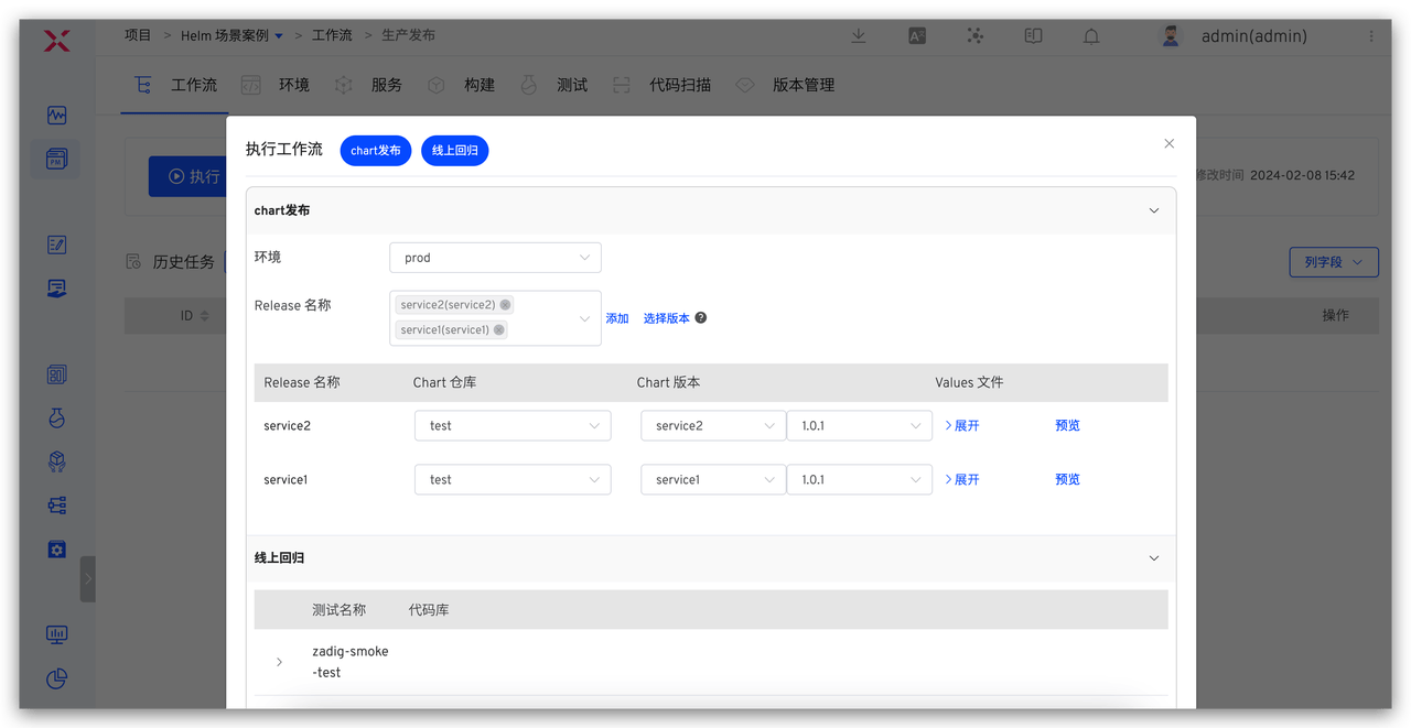 - 执行生产发布工作流,在「Helm Chart 部署」任务中选择版本,将版本内包含的所有 Chart 更新到指定环境。