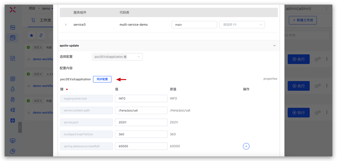开发工程师代码实现完毕后需要自测联调时,执行 demo-workflow-dev 工作流,选择需要更新的服务,在 Apollo 配置变更任务中选择配置项并修改配置内容。