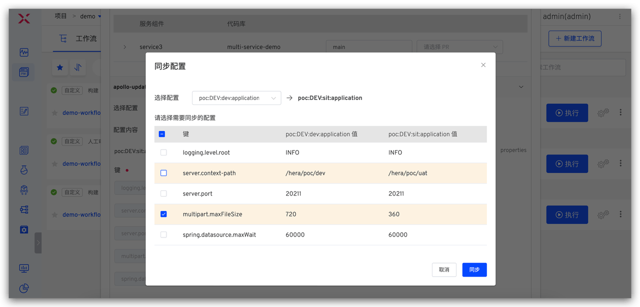 如下图所示,点击「同步配置」,选择开发环境的服务配置,可以获取开发环境和测试环境之间的配置差异,选择需要同步的配置。点击同步按钮后,通过变更前后的比对,一目了然地了解变更的内容。最后,点击执行工作流即可完成对测试环境配置的自动化变更。