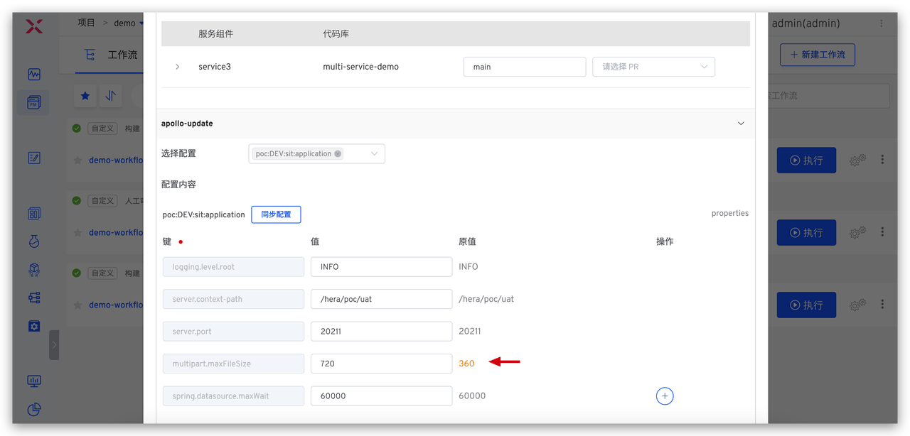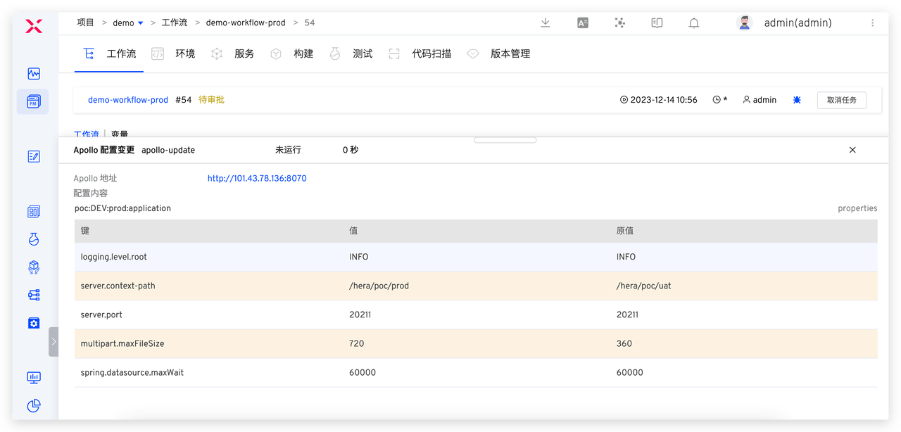 发布工程师执行 demo-workflow-prod 工作流进行生产发布,选择要变更的 Apollo 配置并修改内容。