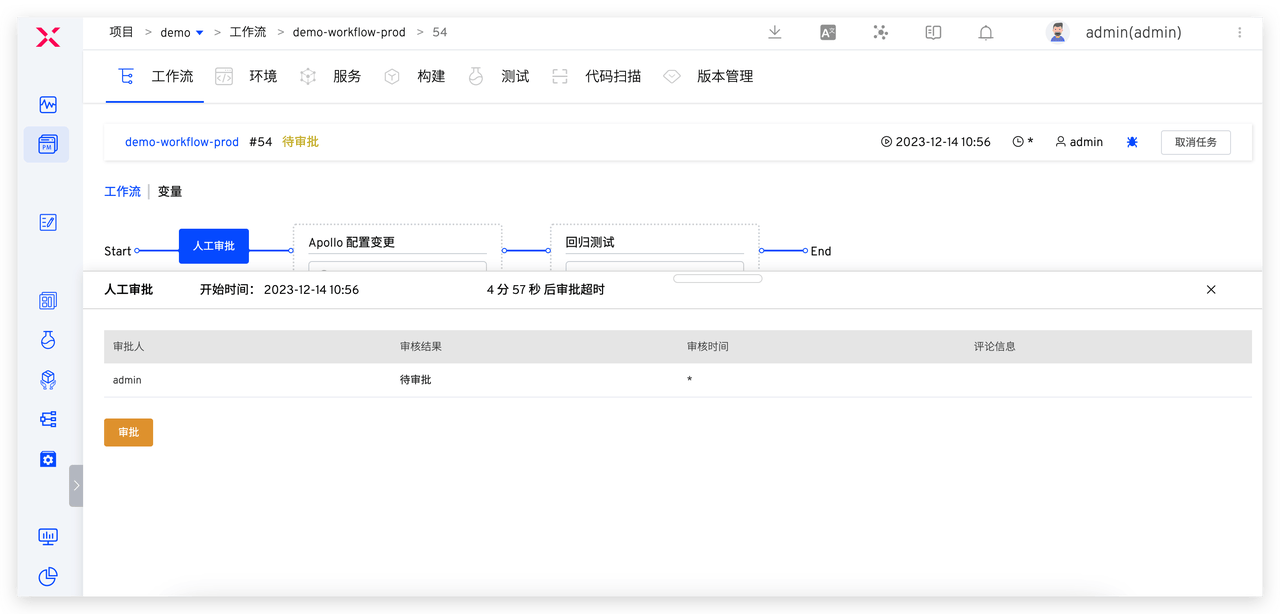 | demo-workflow-prod | 生产发布 | SRE 审批 > prod 环境 Apollo 配置变更 > 部署 prod 环境 > 回归测试 |