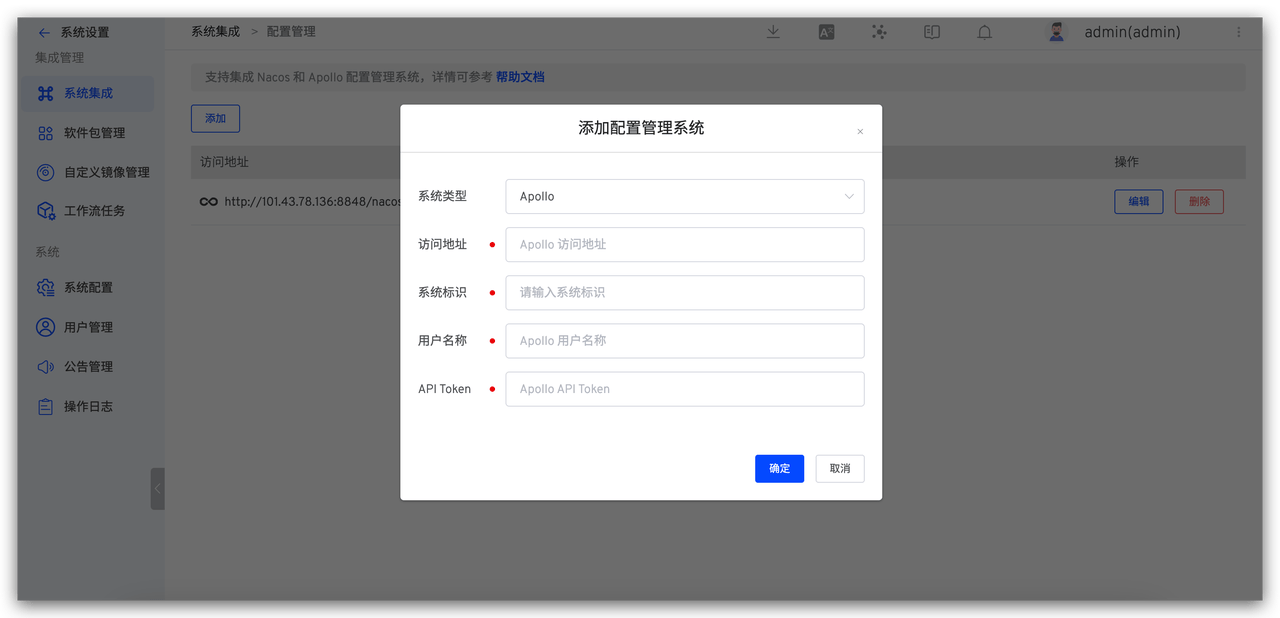 访问 Zadig 系统设置 > 集成管理 > 配置管理 > 添加 Apollo 配置管理系统。