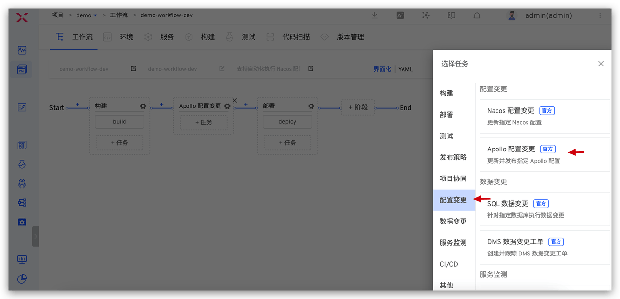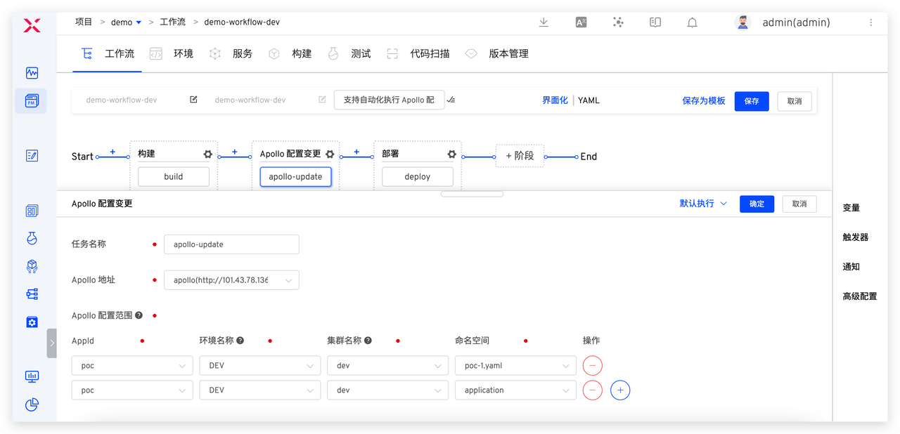管理员在 Zadig 中集成 Apollo 配置管理系统,配置工作流「Apollo 配置变更」任务,即可实现配置的自动化变更,帮助工程师完成配置的一致性传递。