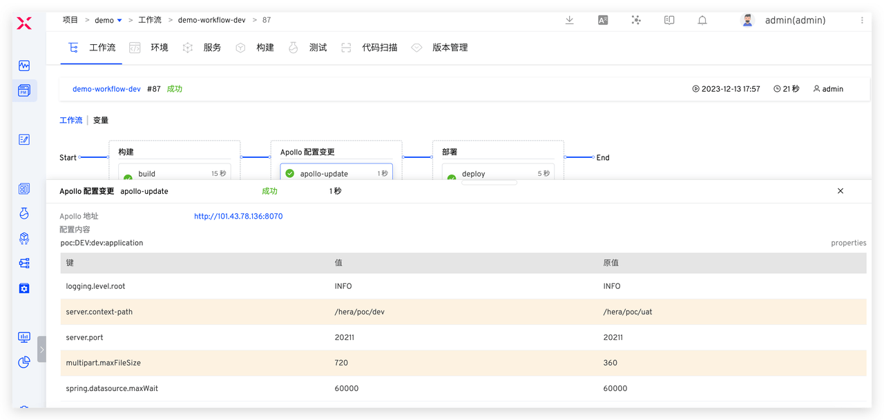 配置变更成功后会自动执行部署任务更新开发环境,实现开发环境中业务代码和配置的一键变更,快速自测联调。