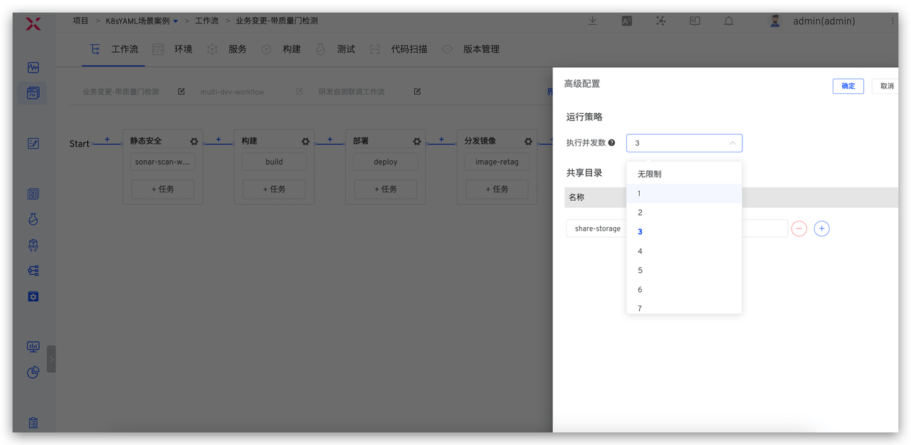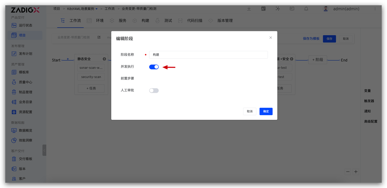 Zadig 工作流仅需在「阶段」上打开「并发执行」的开关,即可实现阶段内多个任务的并发执行。
