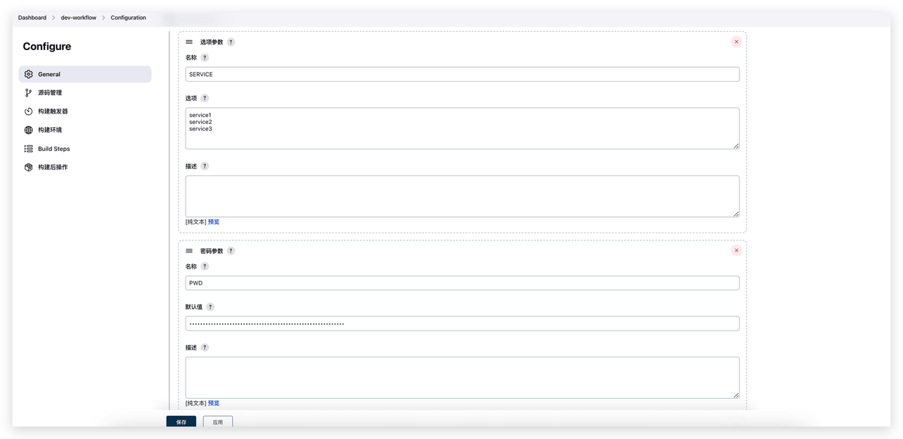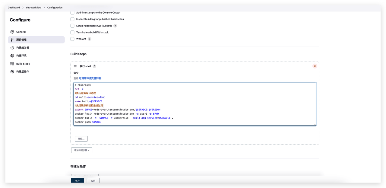 Jenkins 执行脚本及变量如下图所示,脚本中主要进行服务构建、镜像构建以及镜像推送过程。其中 $SERVICE、$VERSION、$PWD 变量需要在配置中定义。