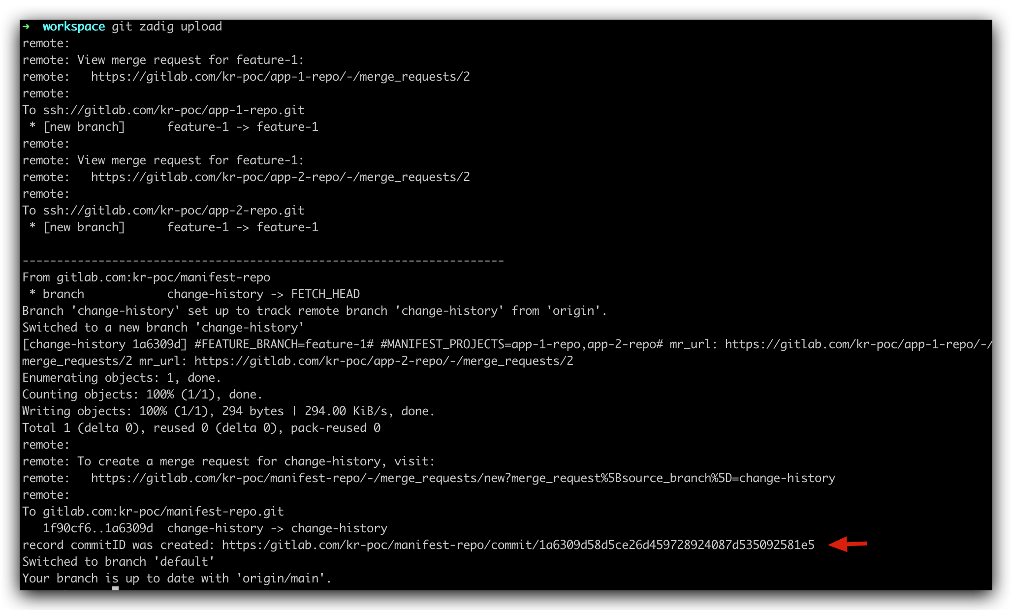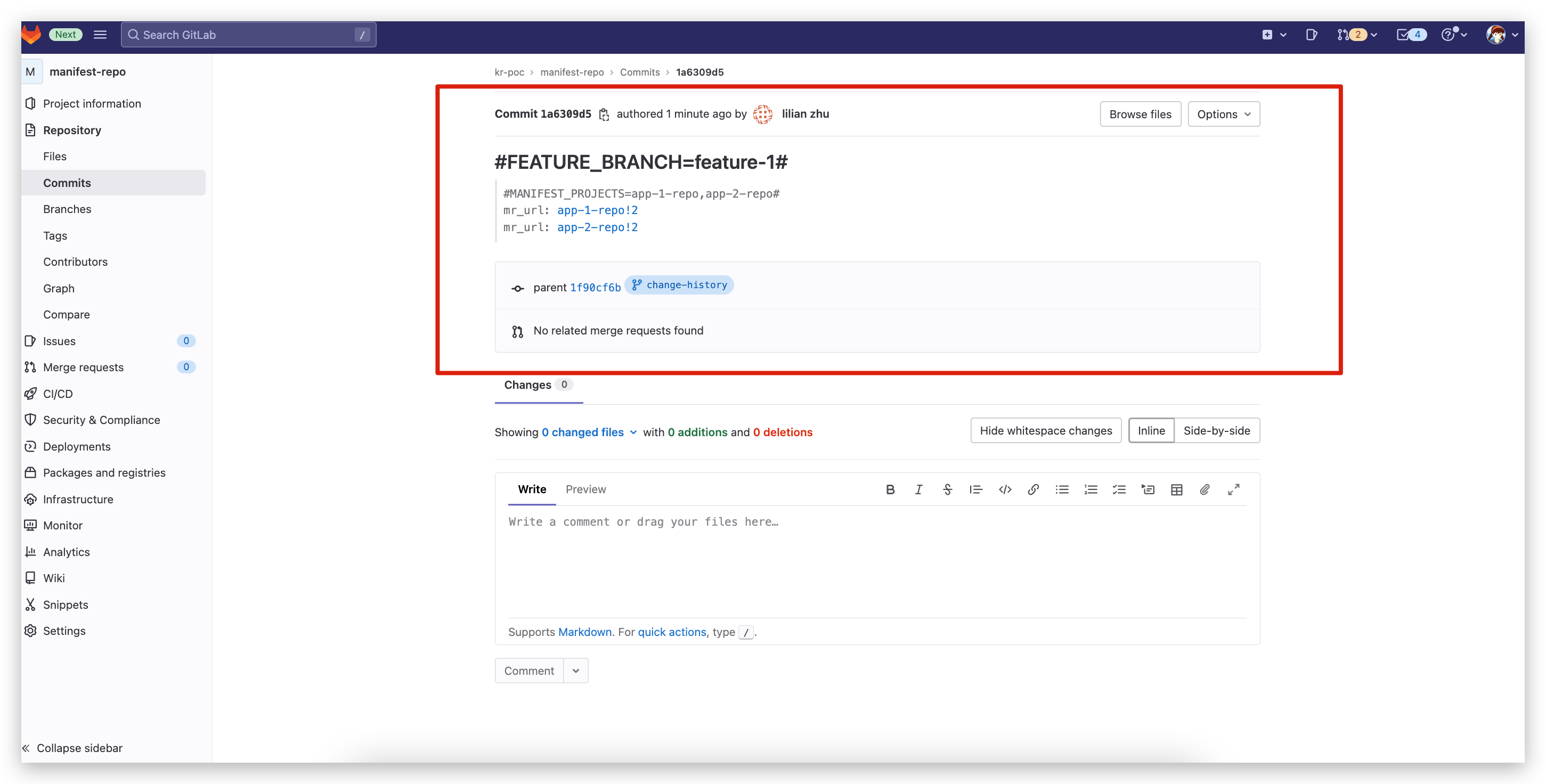 从输出中获取 manifest 仓库的 commit URL,访问 URL,获取多仓库代码提交的汇总信息,包括修改的代码库、feature 分支以及对应的 MR 信息