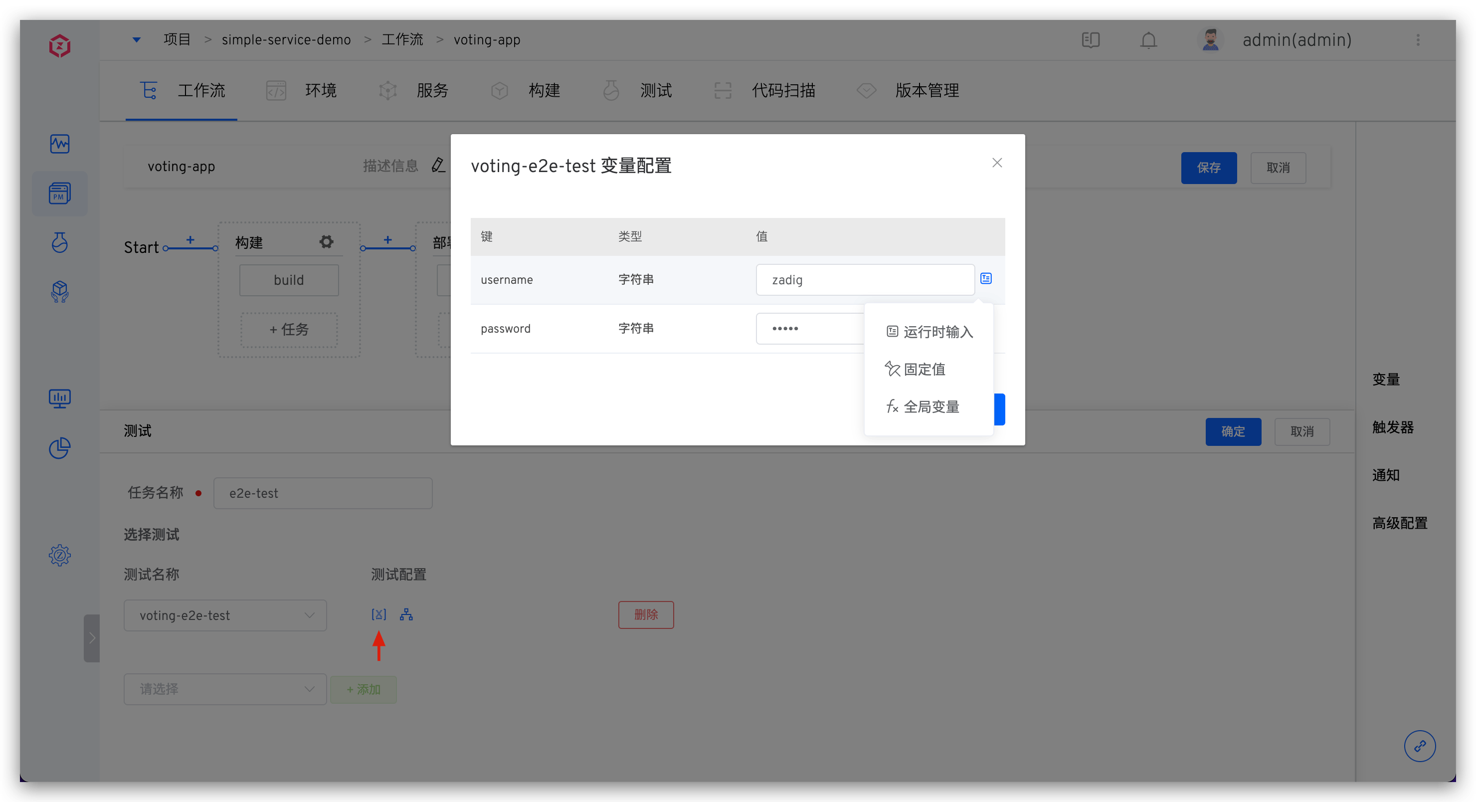 产品测试:指定测试即可服务测试:指定服务组件并配置服务组件和测试的对应关系,其中服务组件来源可指定为运行时输入,也可指定为前置任务输出(包括:构建任务、部署任务、镜像分发任务)服务组件:支持运行时输入和前置构建任务两种配置方式,前置任务中如果有代码信息,那么可以选择引用所选任务的代码信息,如果测试任务的代码库和所选任务的一致,那么执行工作流时只需在前置任务选择服务组件和代码信息,测试任务将自动引用相应输入。