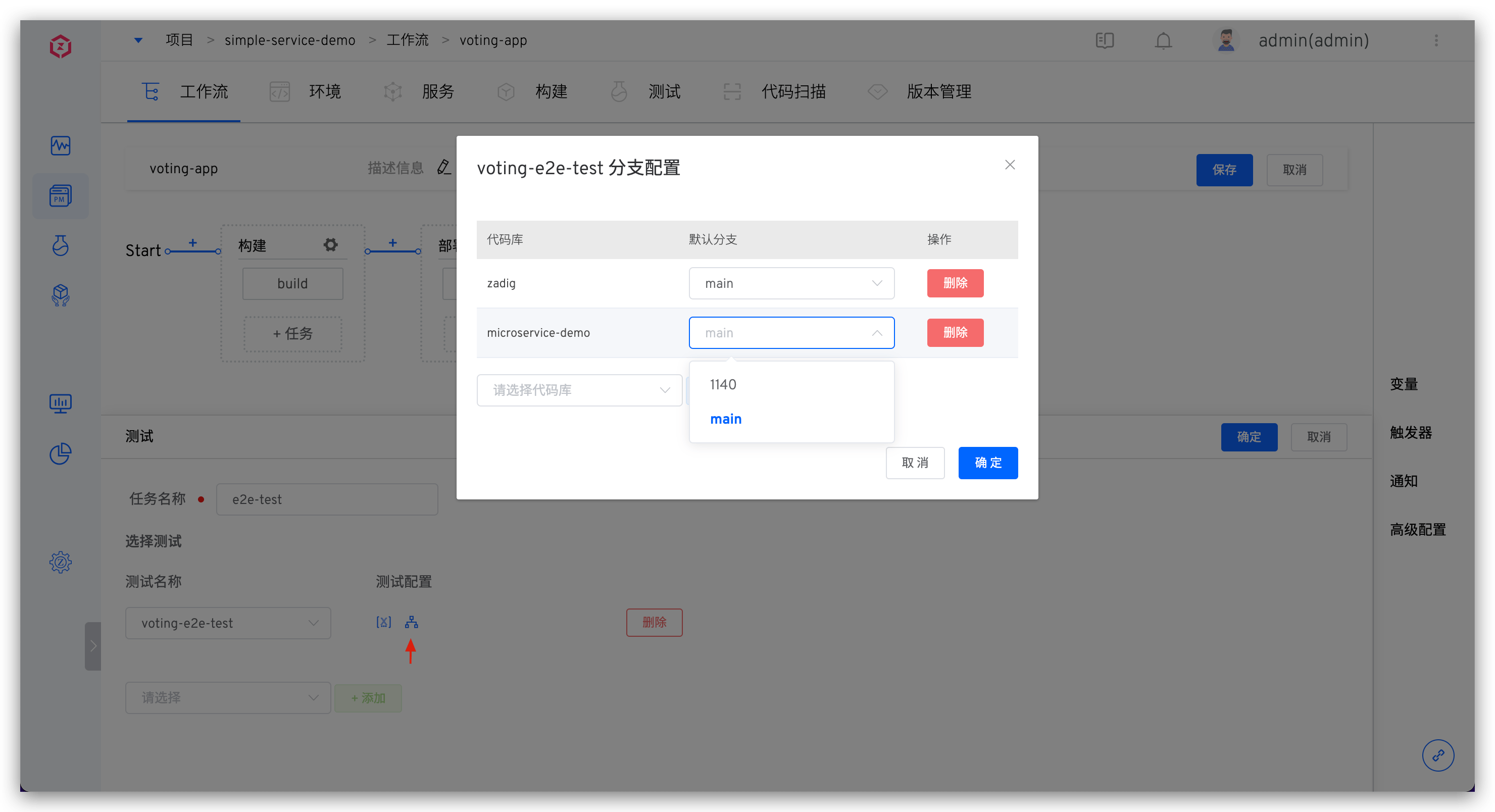 选择具体的测试配置后,可对测试配置中的代码库默认分支和变量进行设置,按需开启共享存储,参考: