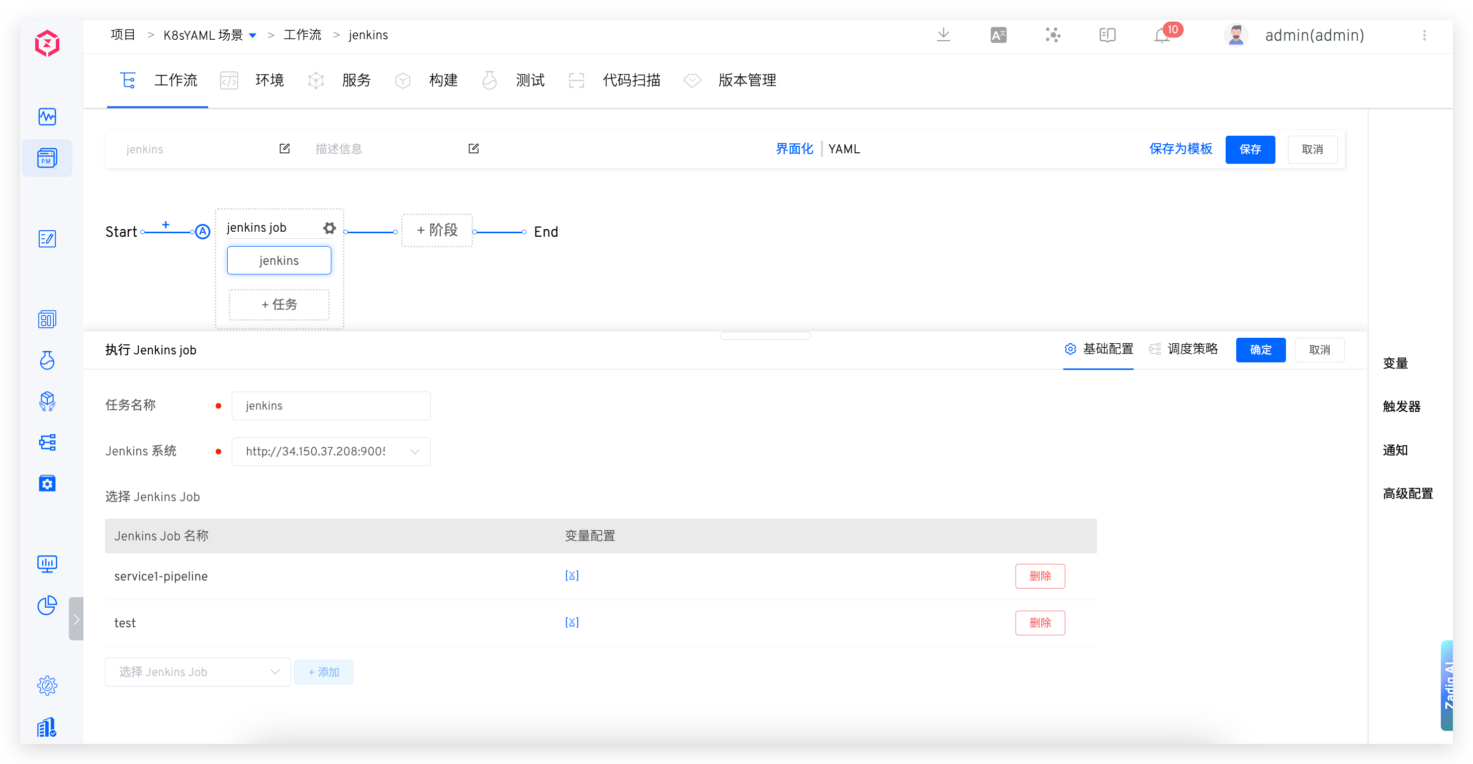 具体配置方式:在工作流中 添加执行 Jenkins Job 任务 -> 选择 Jenkins 系统 -> 添加多个 Jenkins Job -> 配置 Jenkins Job 中的参数即可。