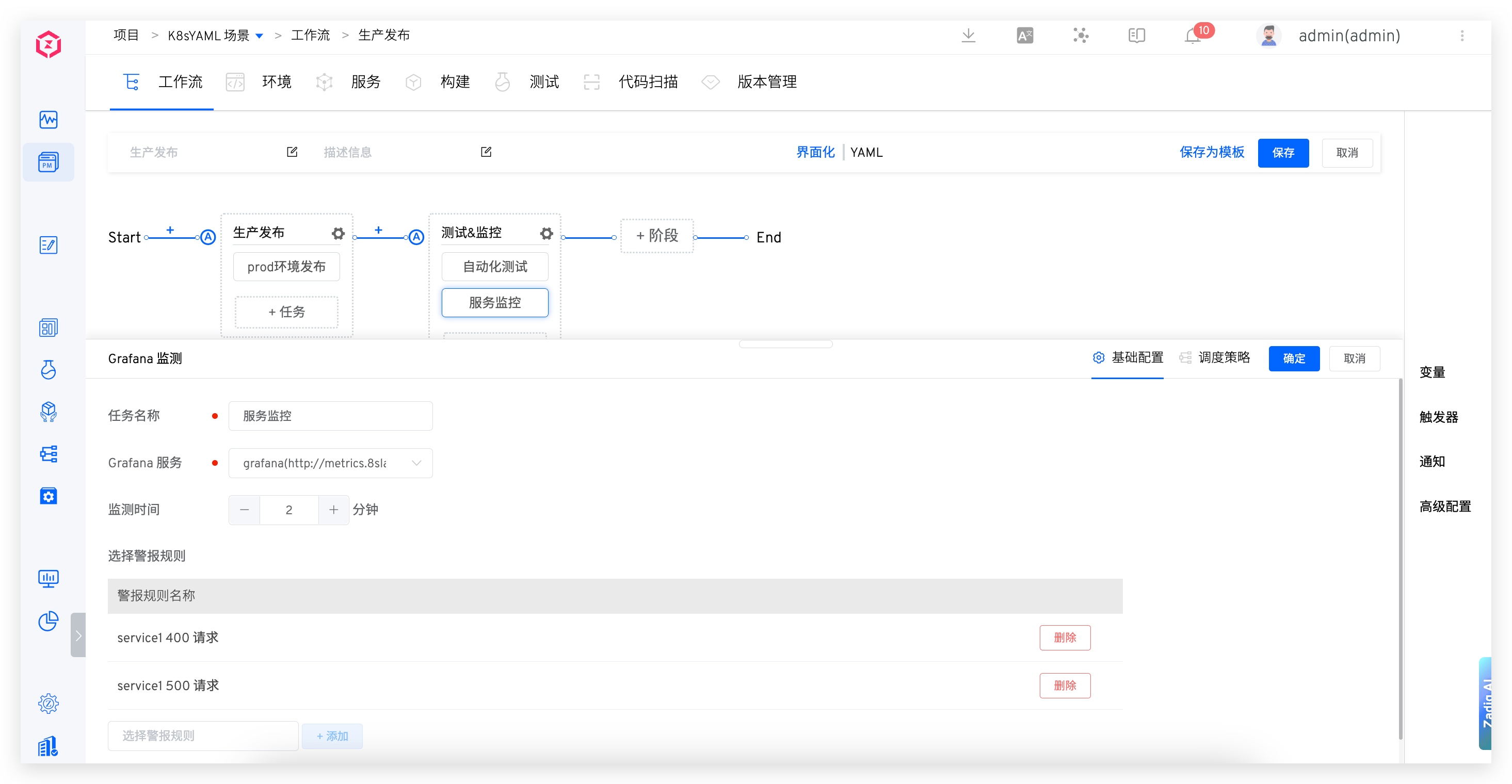 Grafana 服务:选择系统集成中配置的 Grafana 监测系统监测时间:配置 Grafana 监测时间选择警报规则:选择 Grafana 系统中的配置的警报规则失败策略:配置工作流任务失败的策略,包括以下两种单个监控异常任务立即失败:只要有一个监测器结果异常,工作流任务就失败结束,不会等待所有监测器执行完毕所有监控完成后存在异常时任务失败:所有监控器执行完毕后有异常结果时,工作流任务才失败