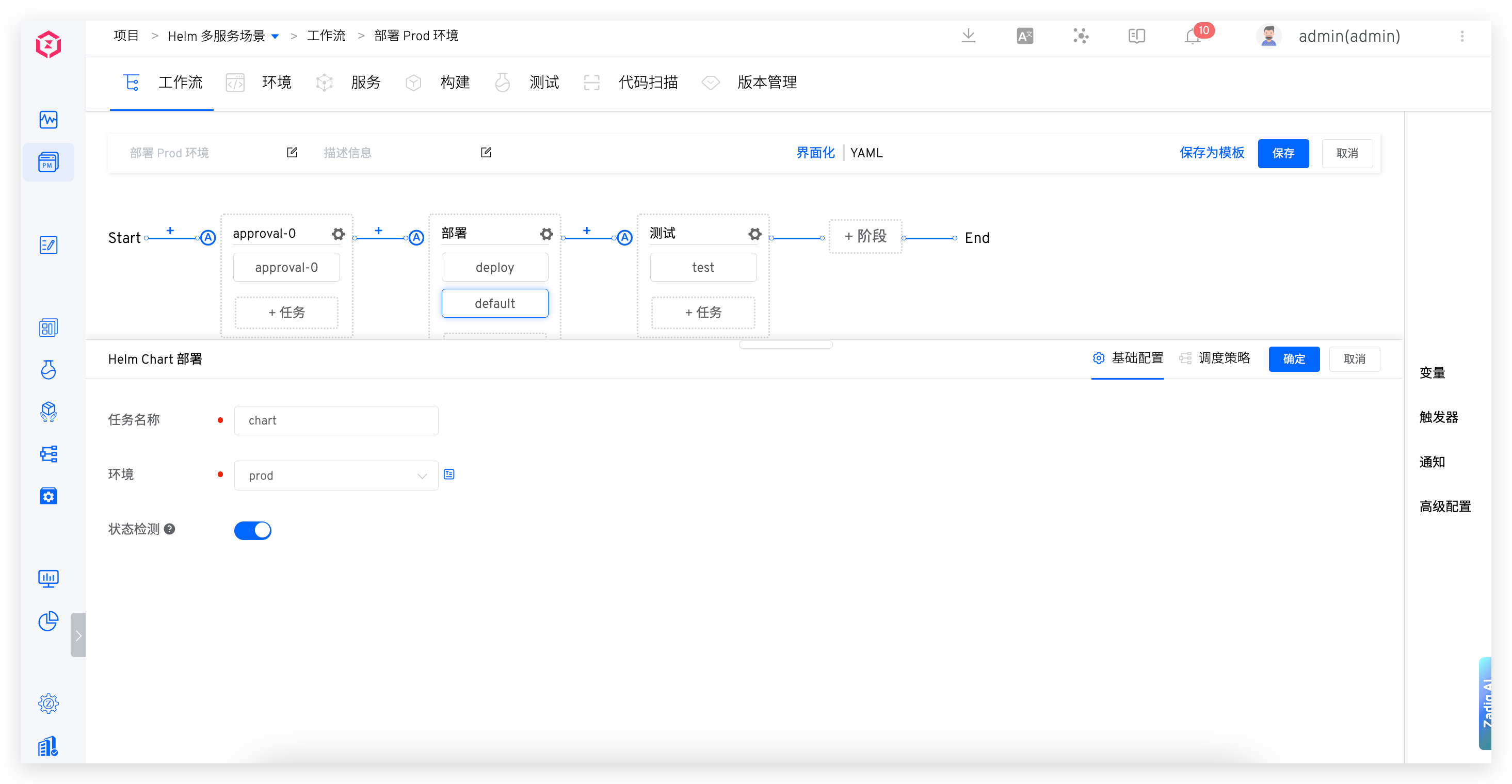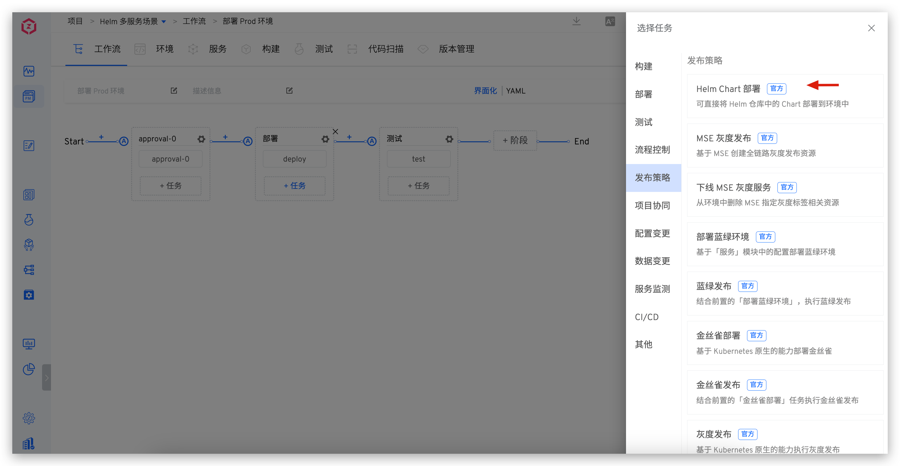 编辑工作流,添加「Helm Chart 部署」任务:点击「+ 任务」,选择「Helm Chart 部署」任务并配置环境。