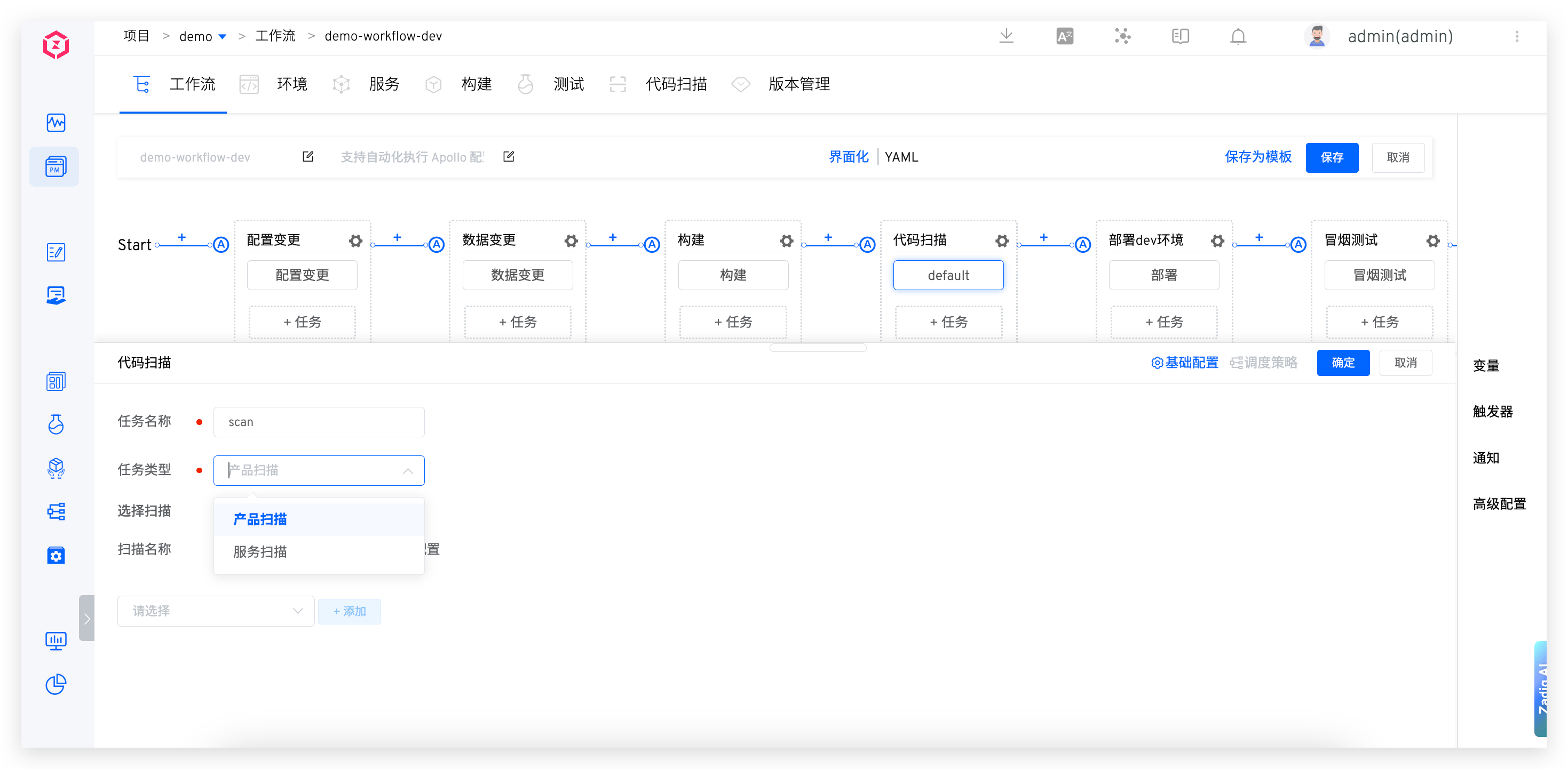 任务名称:在同一个工作流中,任务名称需唯一。任务类型:产品扫描:指定代码扫描即可。服务扫描:指定服务组件,并配置对应的代码扫描任务进行扫描,服务组件的选择支持来自前置任务输出,可串接构建任务。服务组件:支持运行时输入和前置构建任务两种配置方式,前置任务中如果有代码信息,那么可以选择引用所选任务的代码信息,如果代码扫描任务的代码库和所选任务的一致,那么执行工作流时只需在前置任务选择服务组件和代码信息,代码扫描任务将自动引用相应输入。