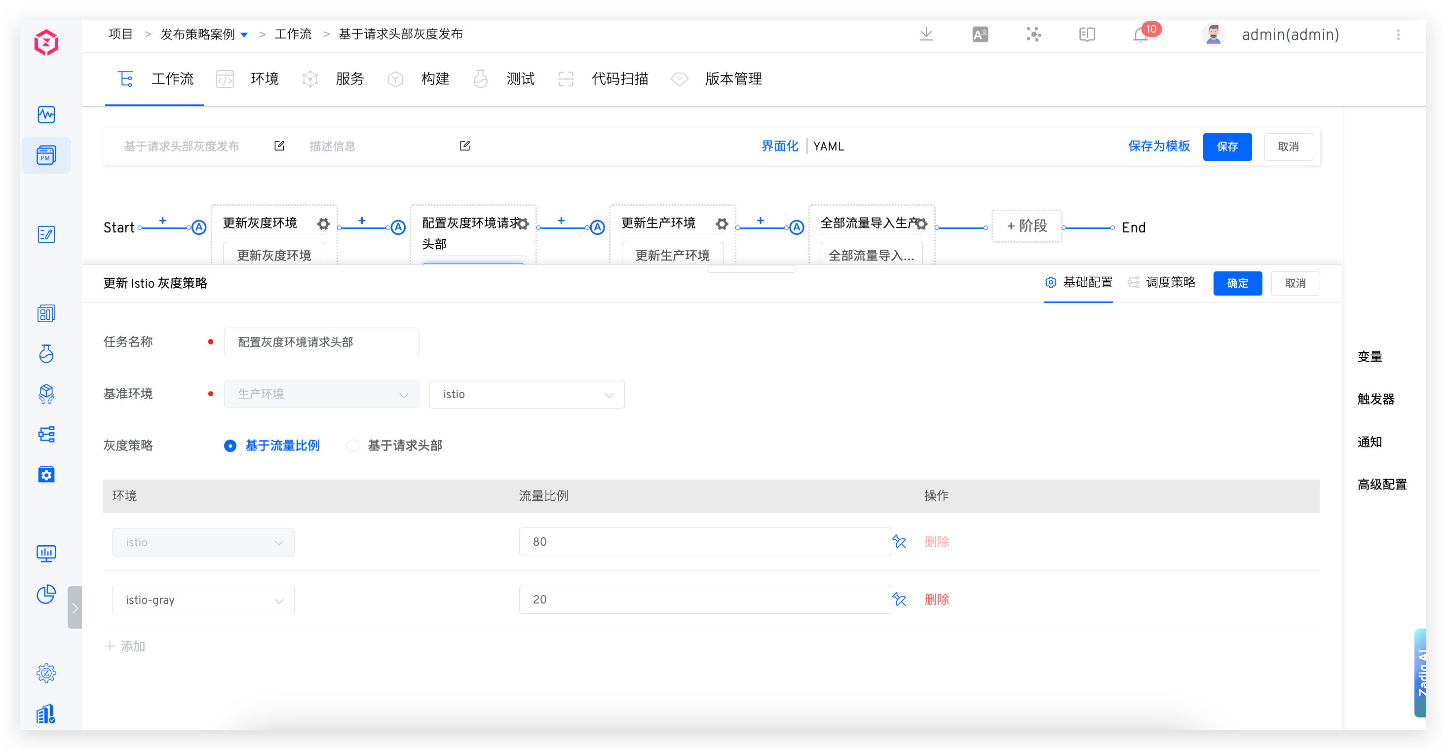 任务名称:在同一个工作流中,任务名称需唯一。基准环境:基准生产环境灰度策略:基于流量比例:根据配置流量比例控制生产流量基于请求头部:根据配置的请求头部控制生产流量