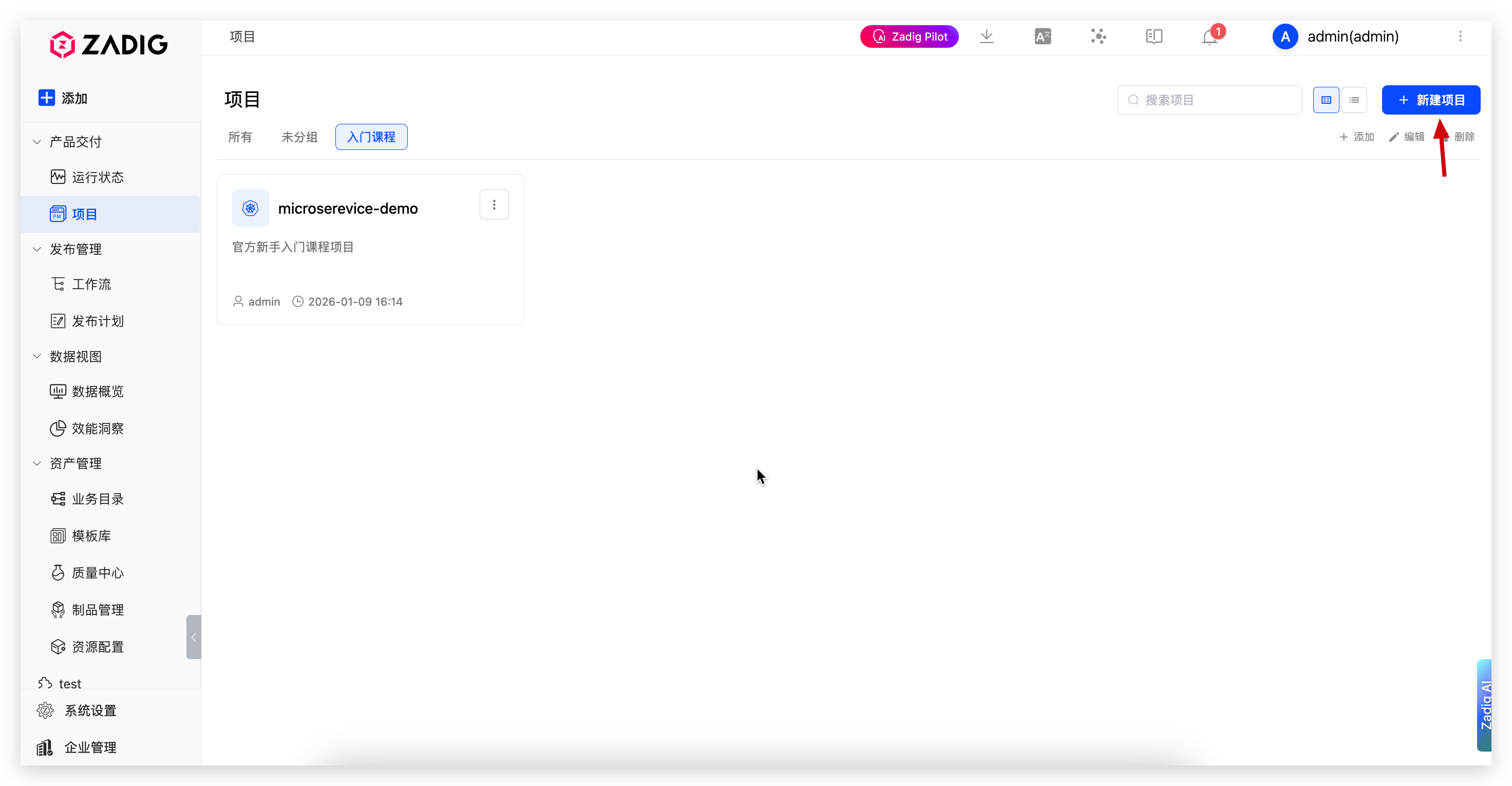 进入 Zadig 系统,点击「项目」-「新建项目」,填写项目名称,选择K8s 托管项目的项目类型新建项目。