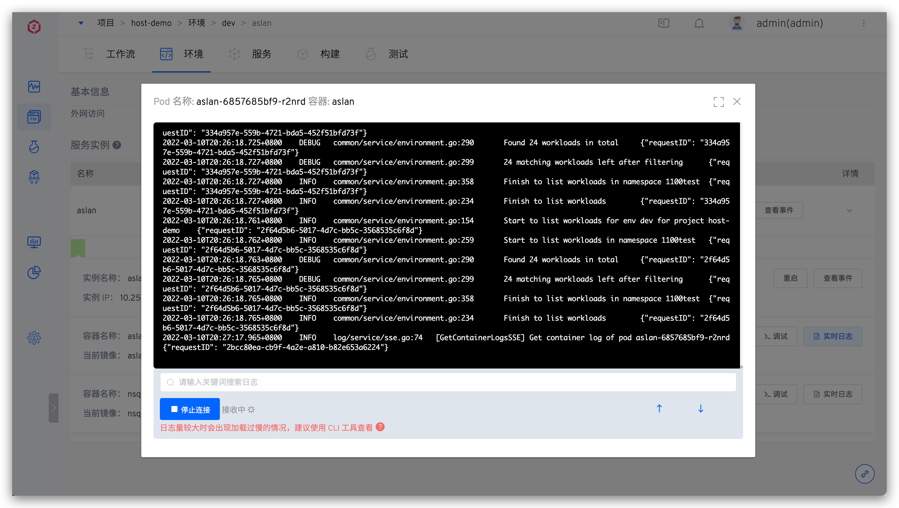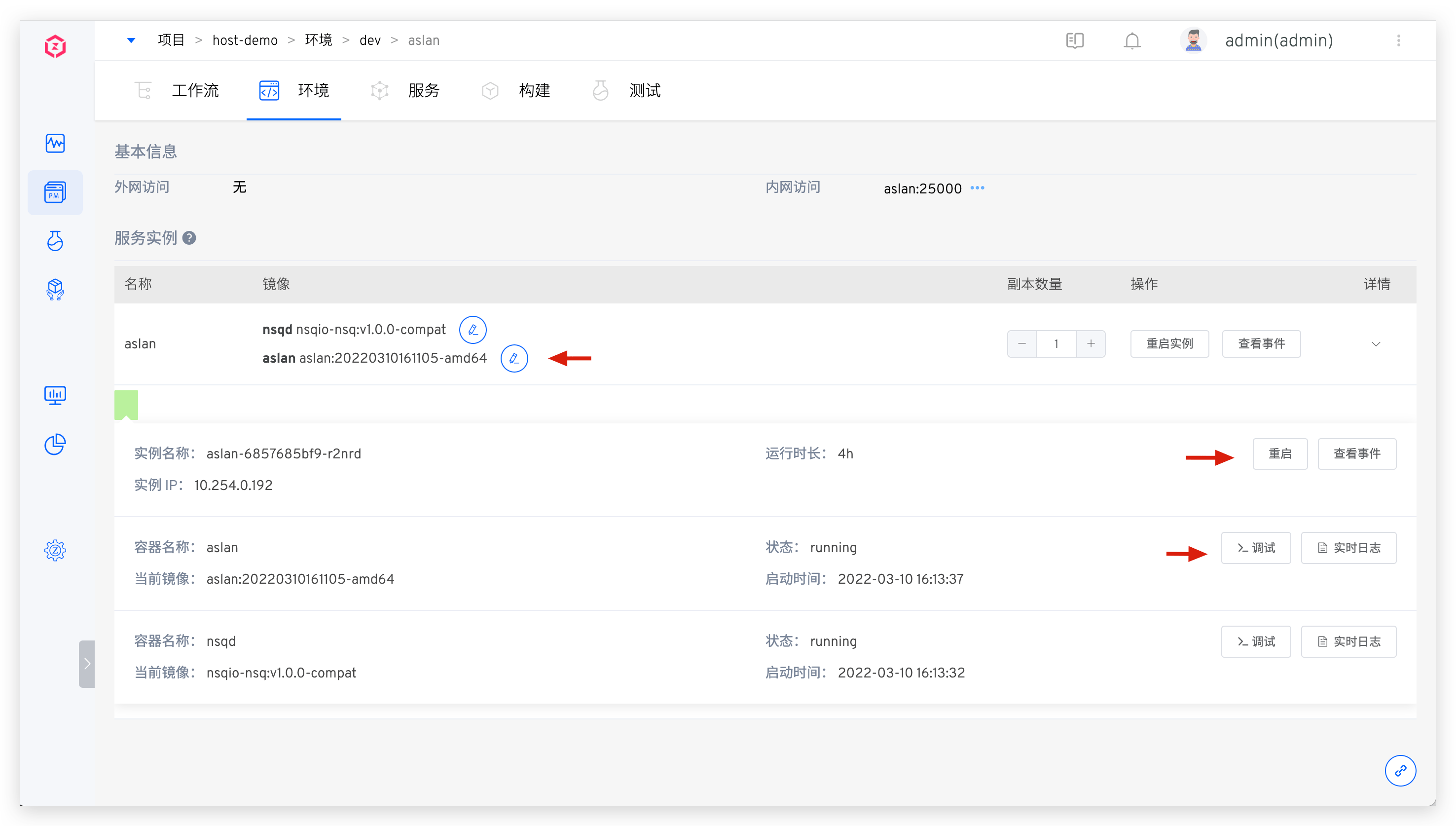 点击具体的服务,可查看该服务更细节的信息,包括但不限于修改服务镜像版本、查看服务部署事件、查看实时日志等操作。