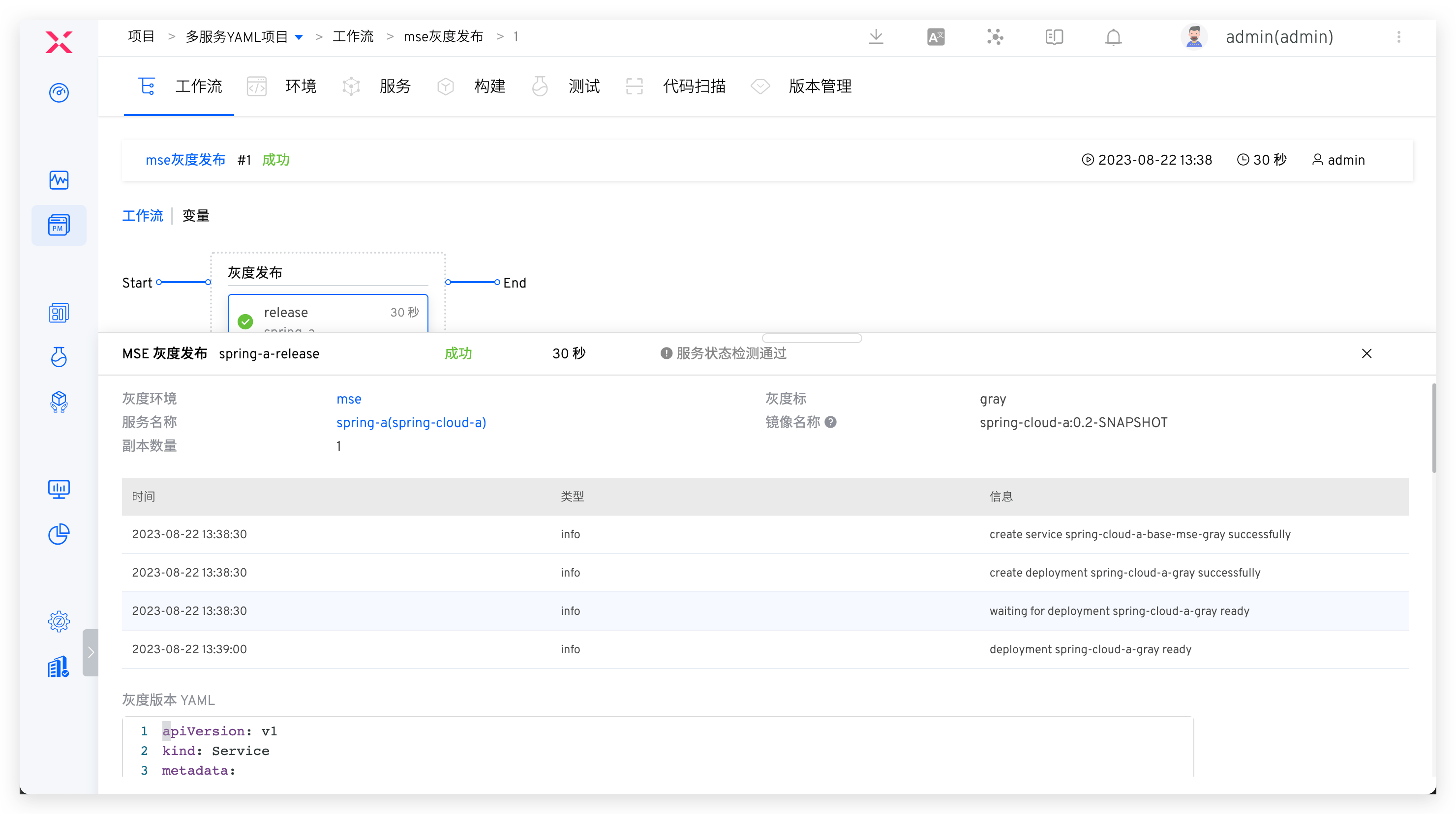 启动工作流,执行 MSE 灰度发布任务,可修改灰度标、灰度镜像、副本数量,以及灰度服务 YAML 配置。