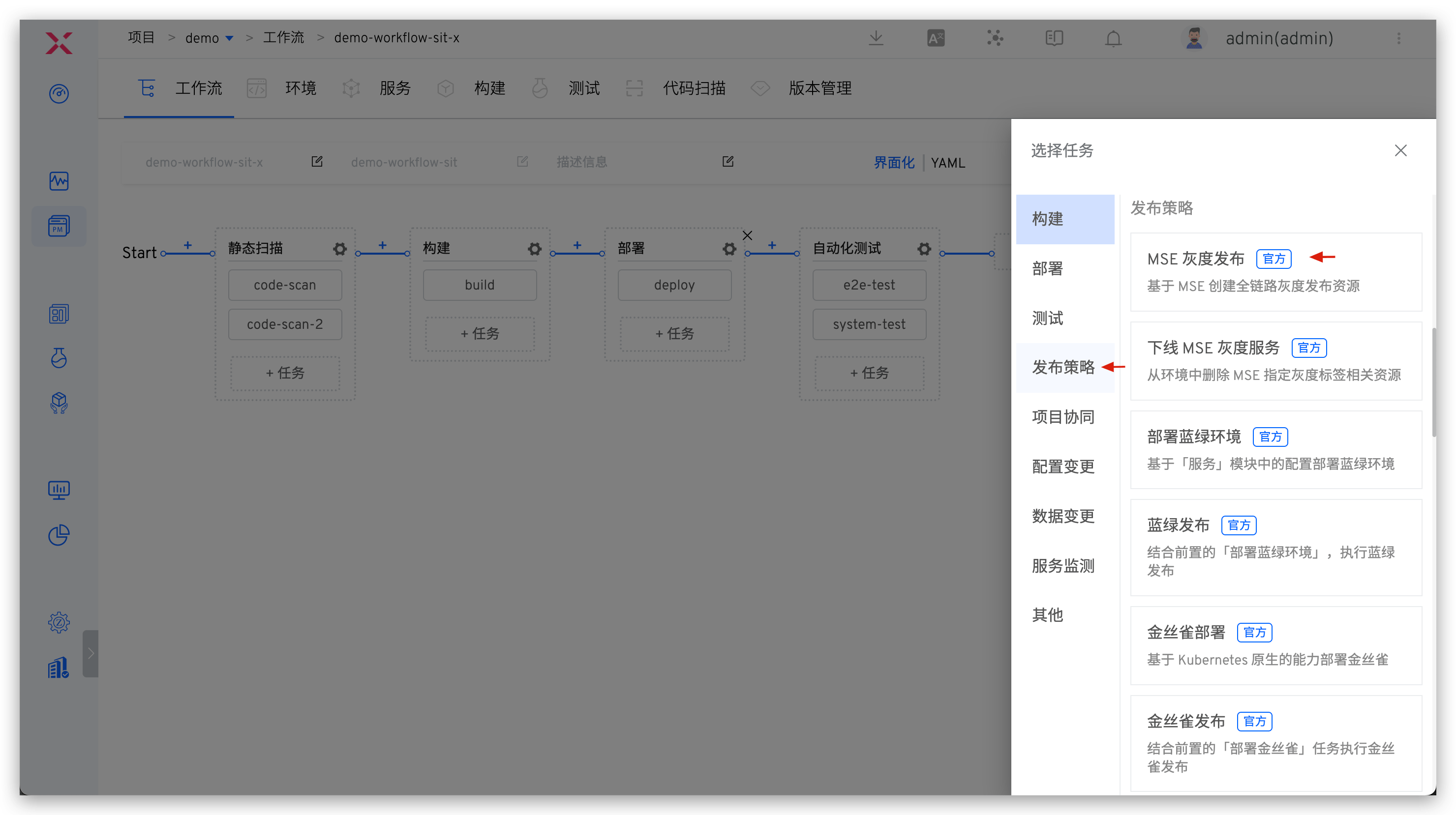 在工作流中添加「MSE 灰度发布」任务。