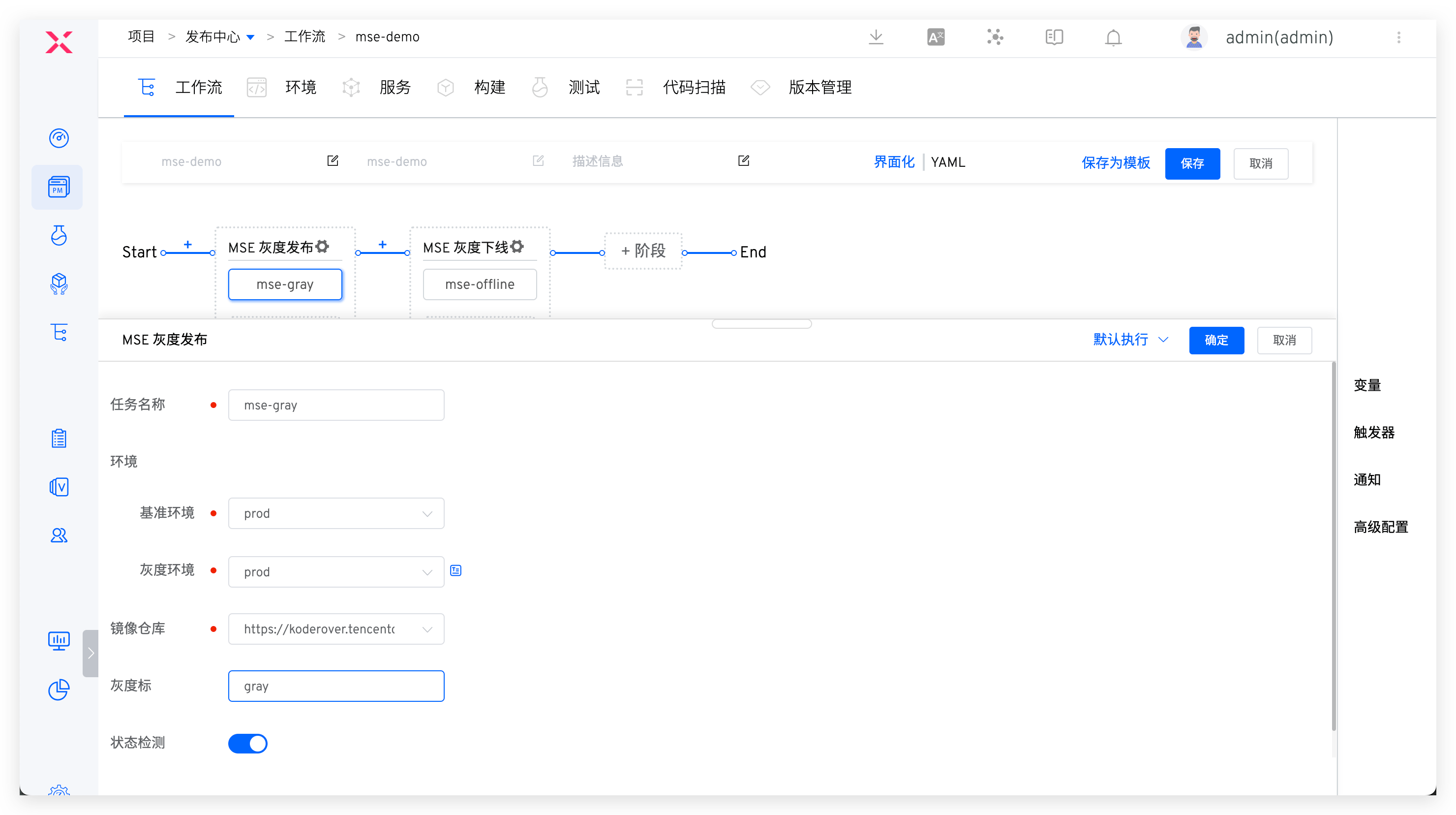 基准环境:选择基准环境,灰度发布任务将会基于基准环境中的服务 YAML 添加灰度发布所需相关资源灰度环境:将要进行灰度发布的环境镜像仓库:灰度镜像所在的镜像仓库灰度标:设置灰度标,后续下线 MSE 灰度服务时将会自动删除带有这些灰度标的资源状态检测:若开启,灰度发布任务会轮询灰度服务运行状态,待服务正常运行后任务状态才为成功