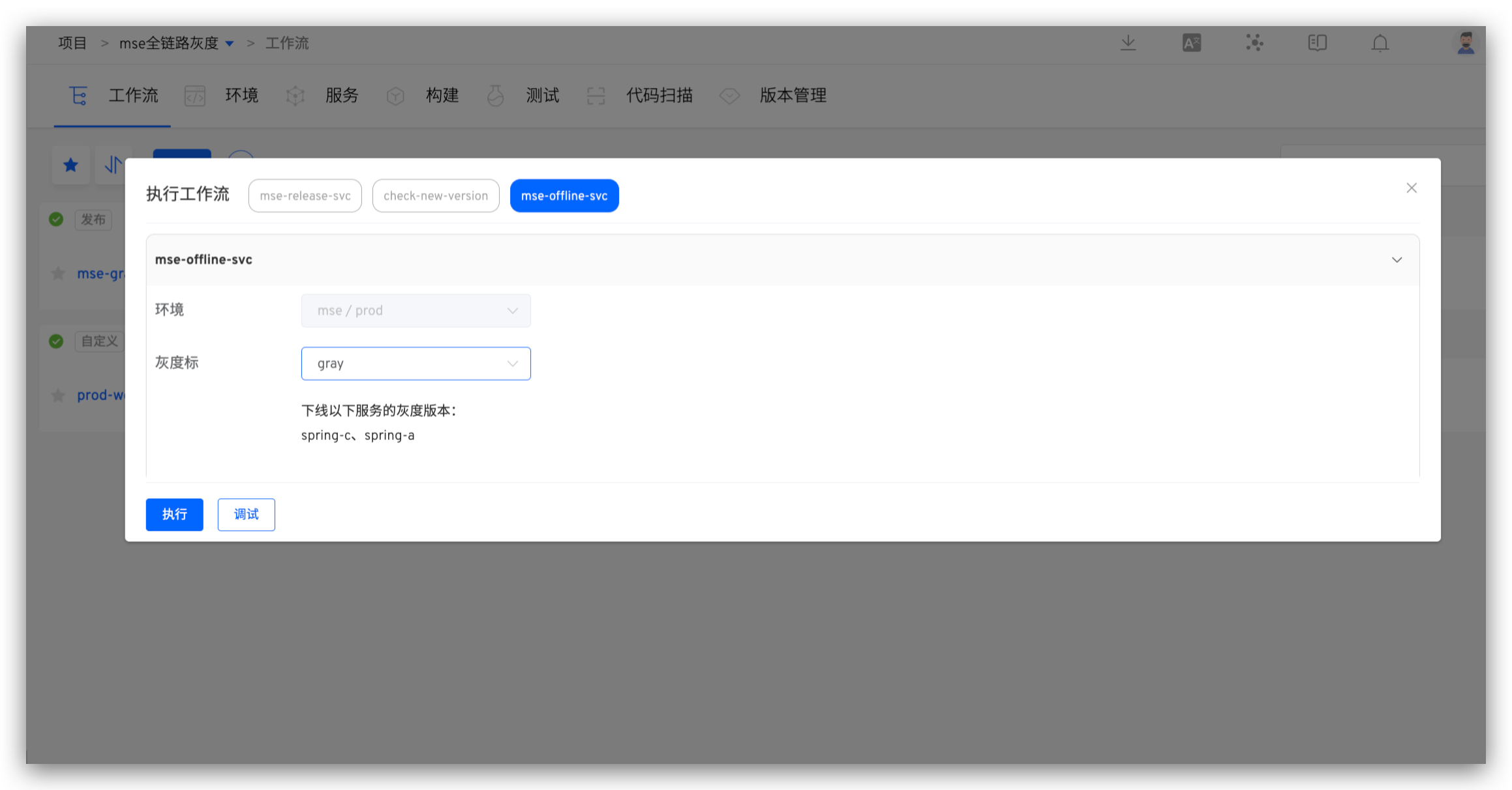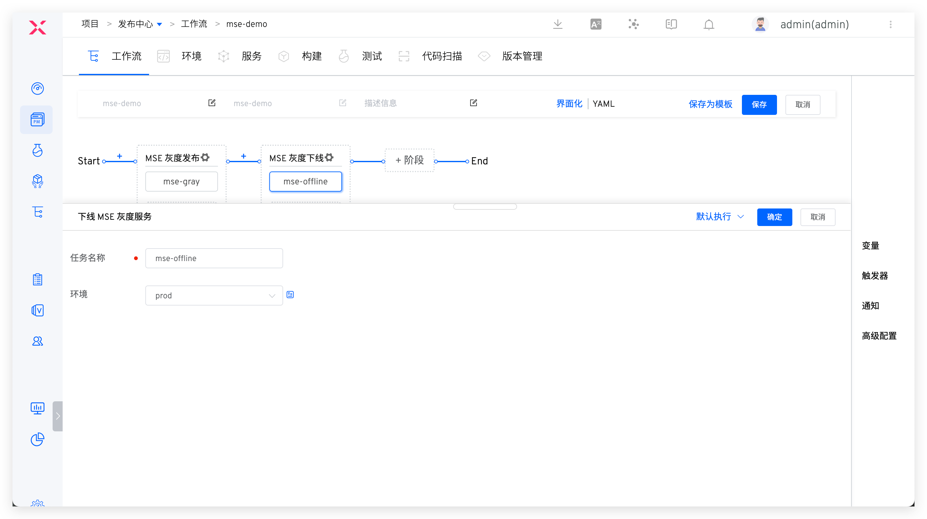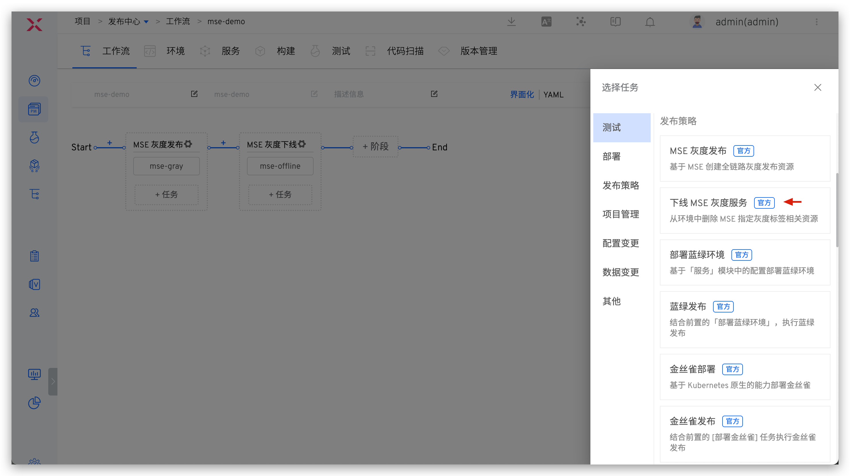 在工作流中添加「下线 MSE 灰度服务」任务并配置灰度环境。