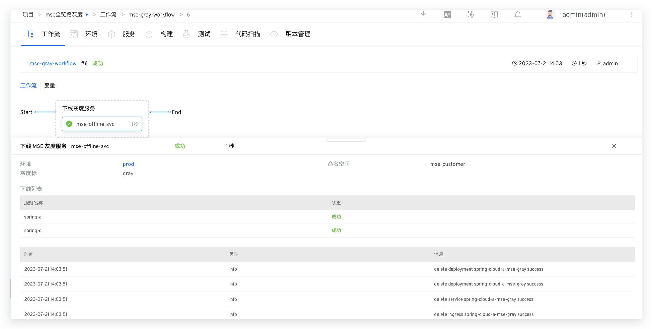 灰度服务验证无误后,启动工作流,执行下线 MSE 灰度服务任务,选择需要下线的灰度标即可自动下线对应的灰度服务。