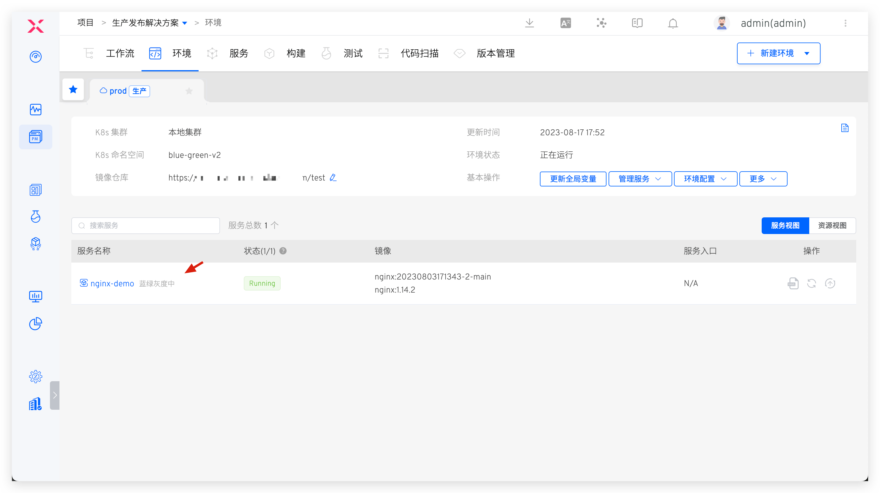 环境:选择生产环境K8s Service 配置:添加需要进行蓝绿部署的服务
