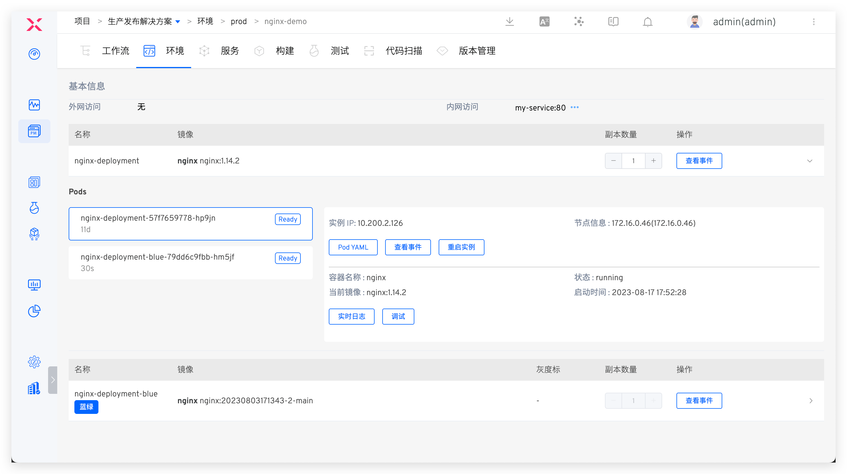 - 人工审批通过并完成金丝雀发布。此时环境已更新为金丝雀版本,如下图所示。