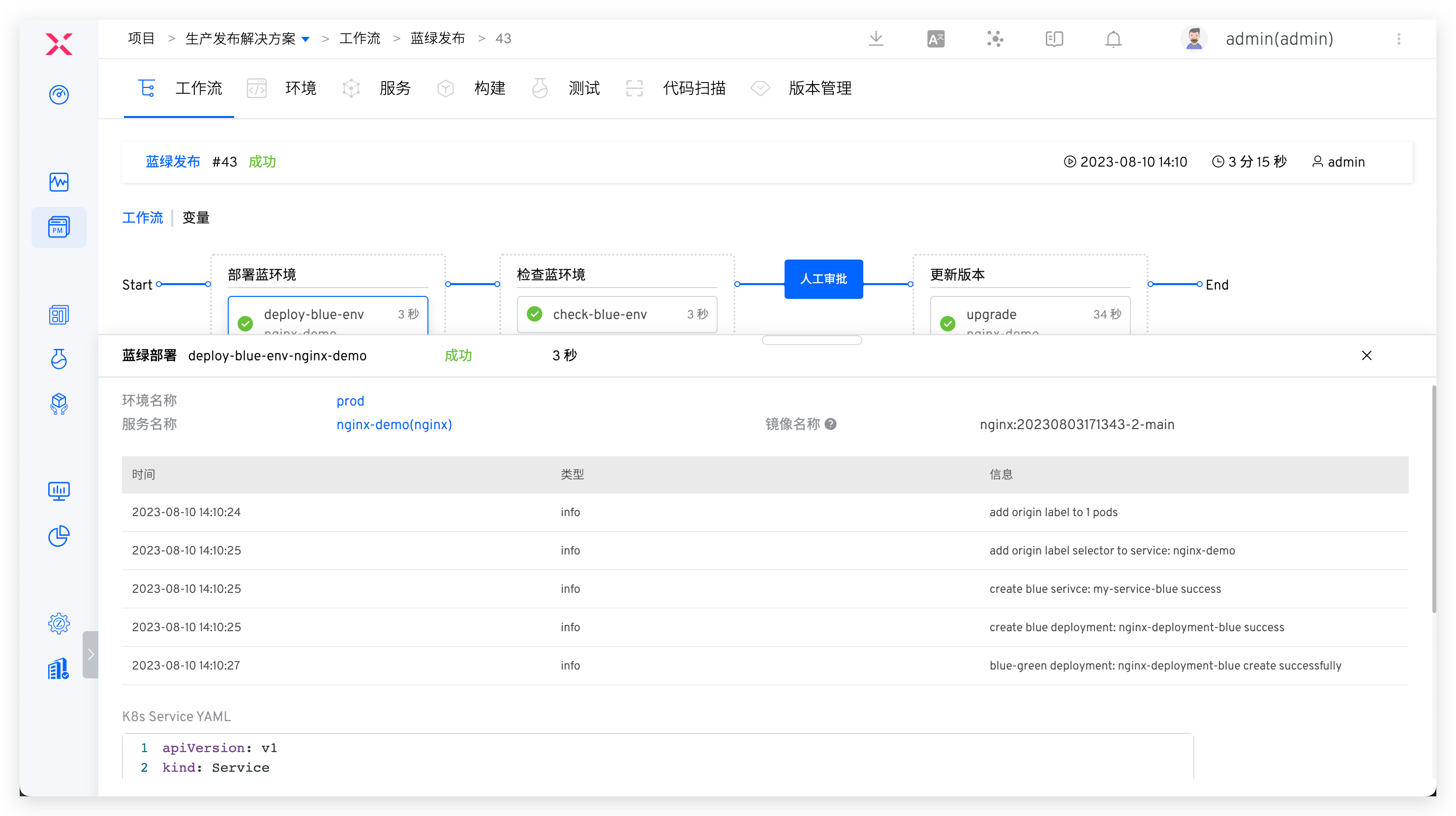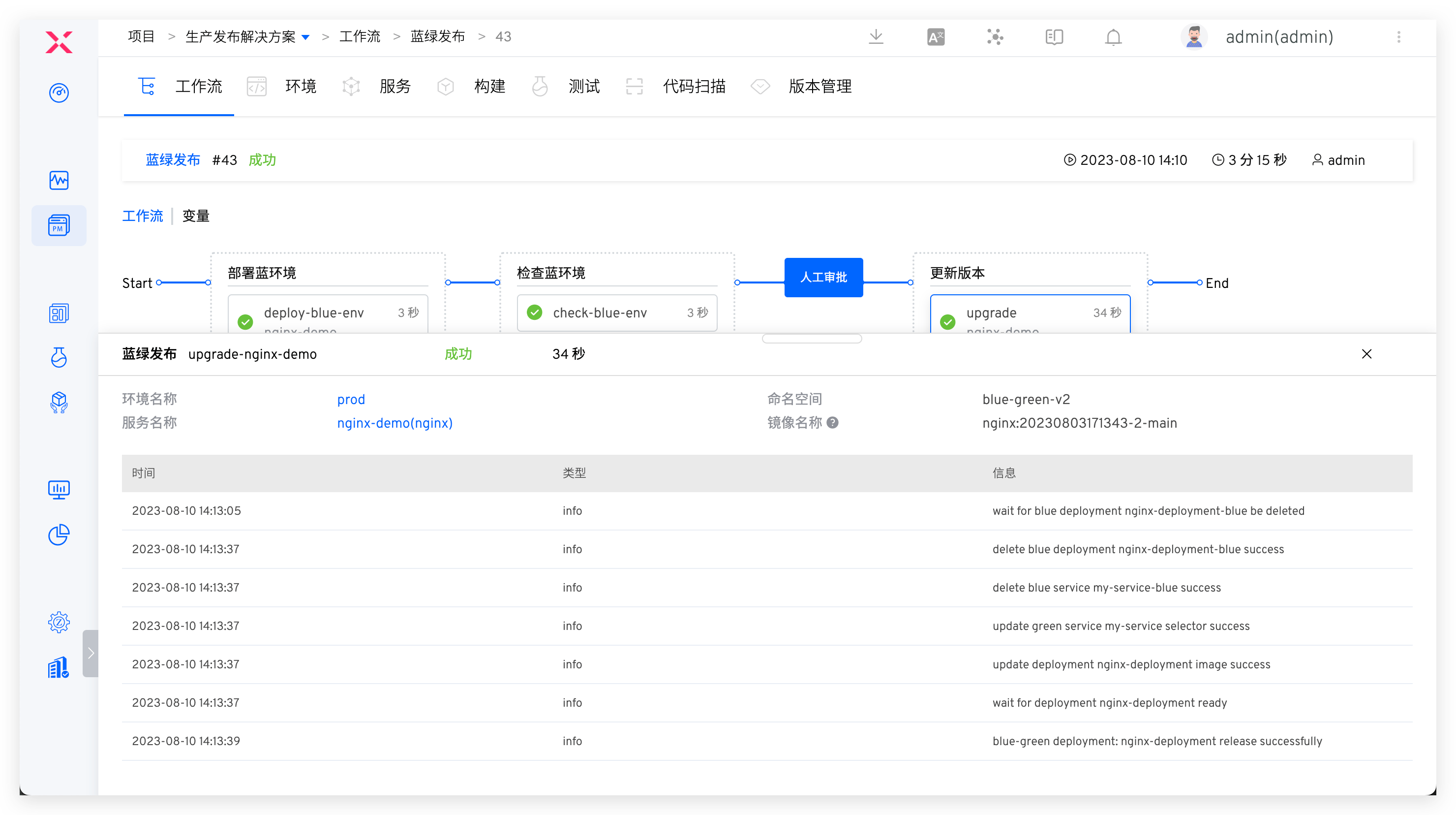 - 工作流按照设置的任务完成执行,点击任务可以查看蓝绿部署和蓝绿发布的具体过程。