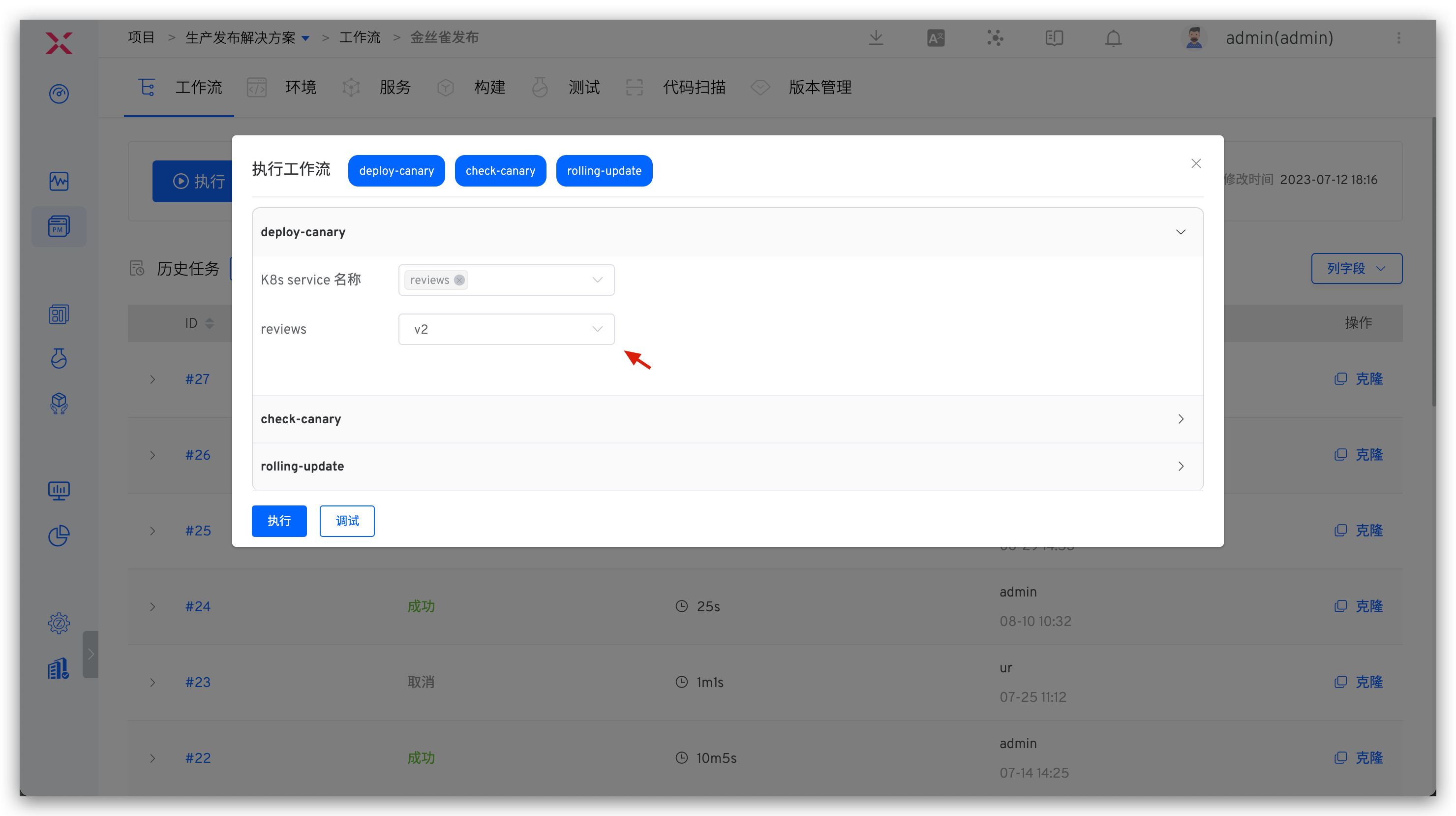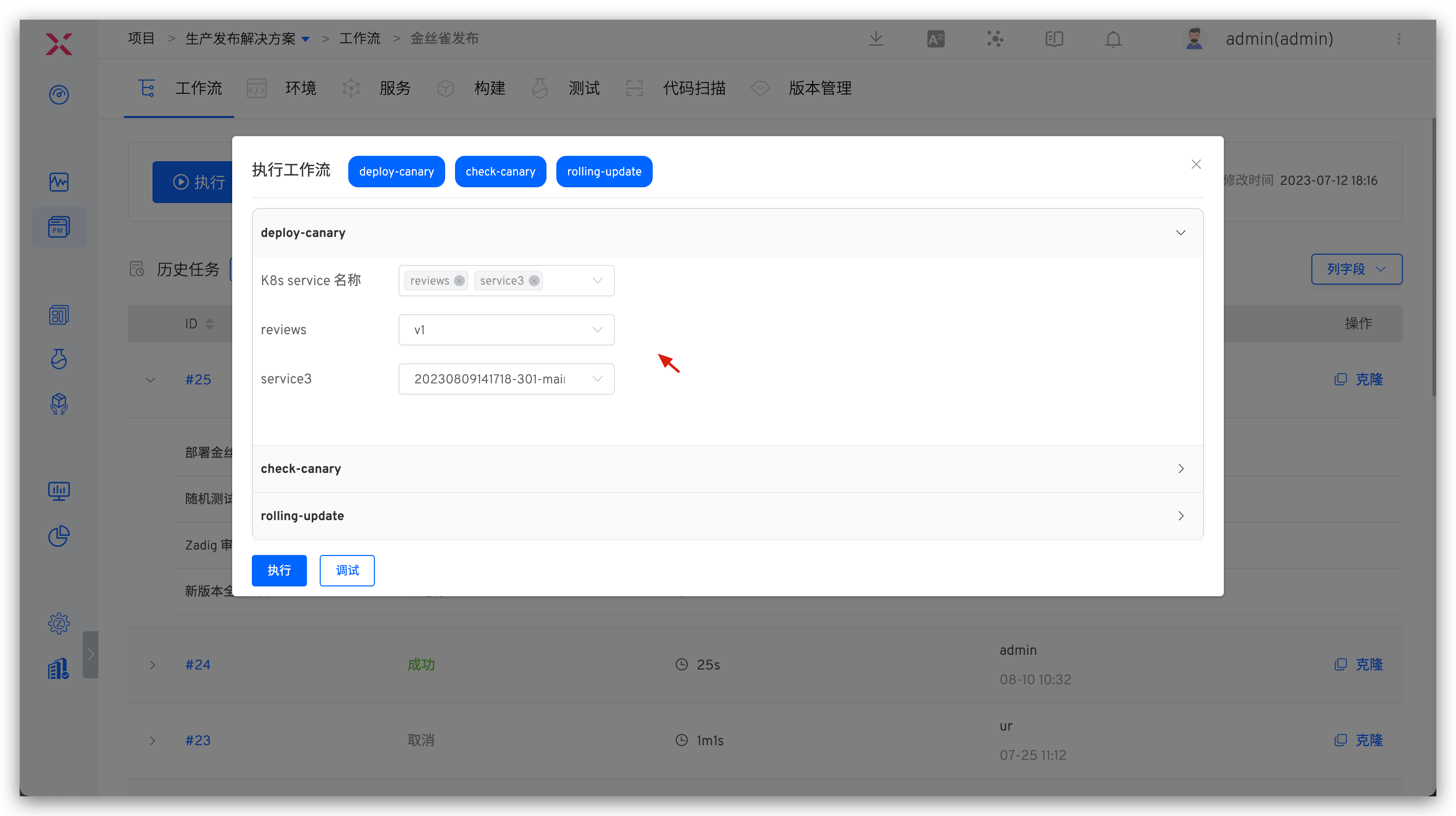 - 执行工作流,选择需要更新的服务组件,指定镜像,按需修改 K8s Service 配置。
