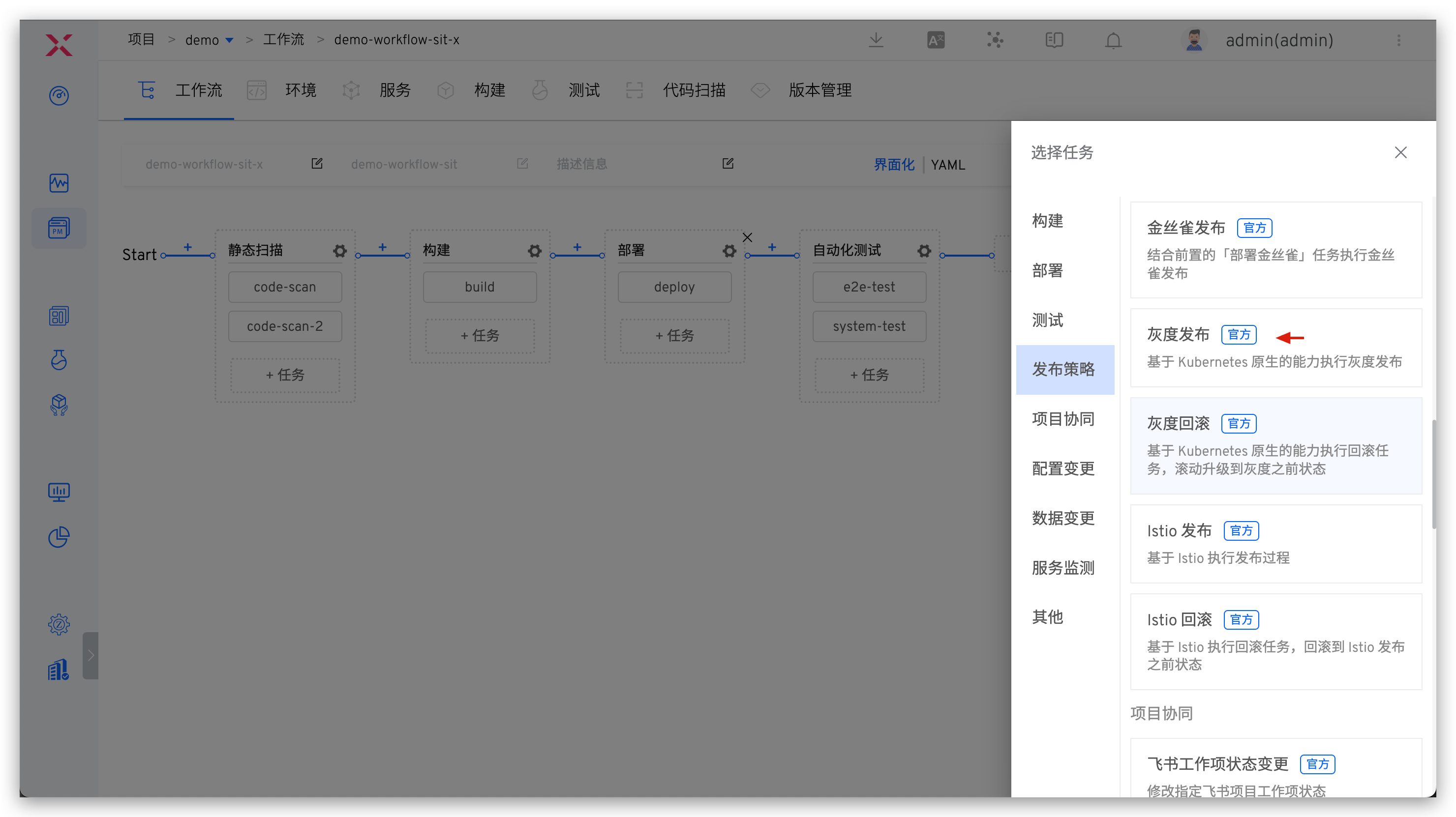 工作流->新建工作流,选择「金丝雀发布」工作流模板来新建工作流。