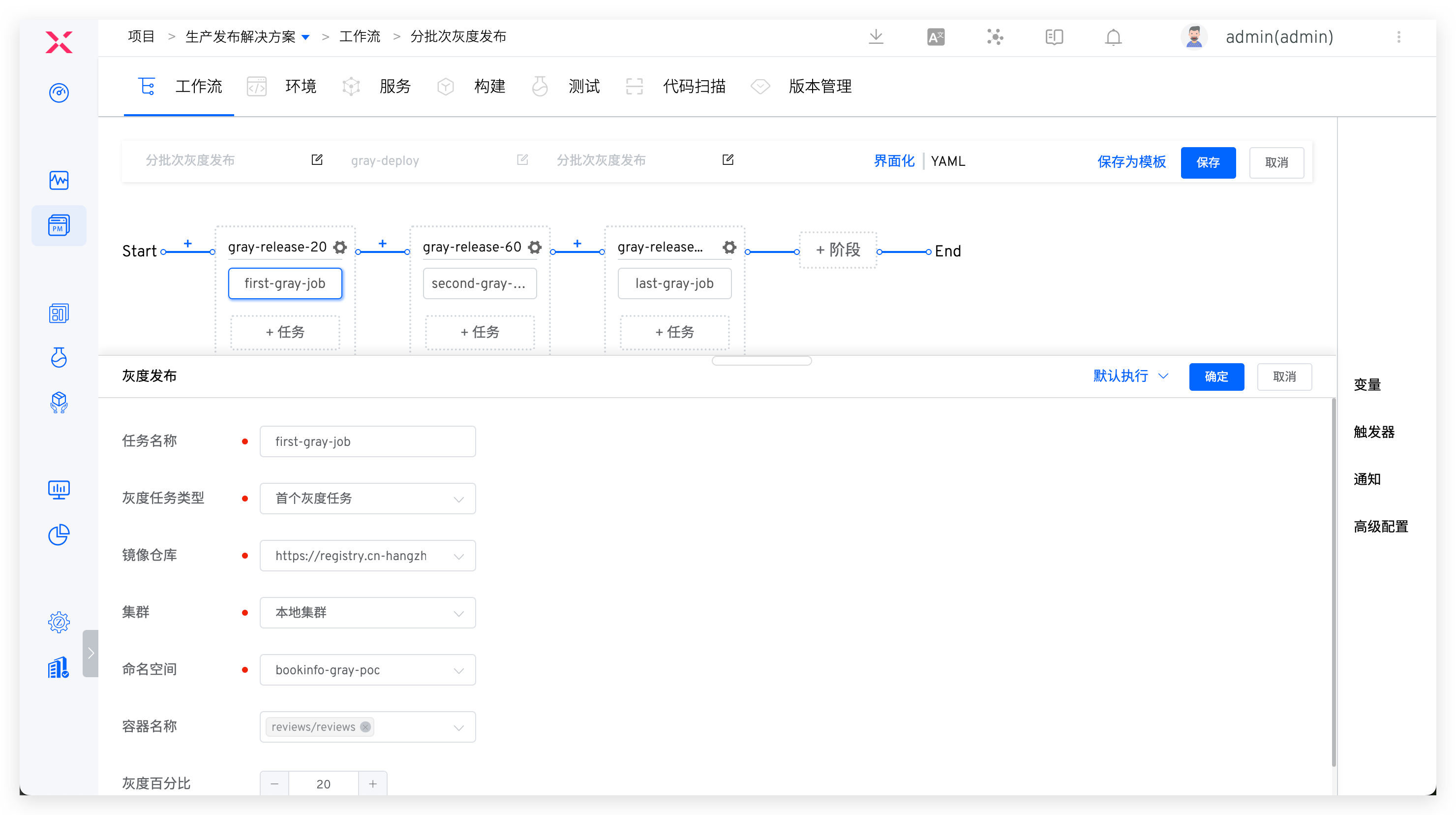 - 编辑工作流,添加「灰度发布」任务:点击「+ 任务」,选择「灰度发布」任务并配置
