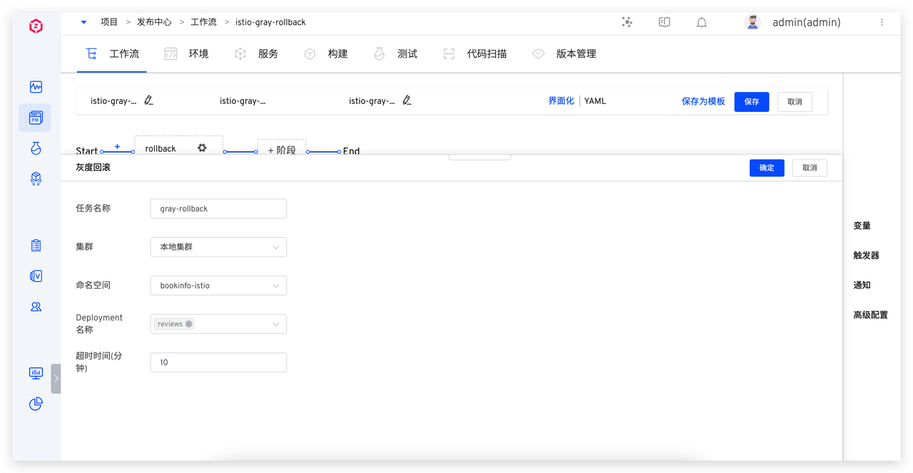 Deployment 名称:只可选择灰度发布过的 deployment超时时间(分钟):回滚任务超时时间