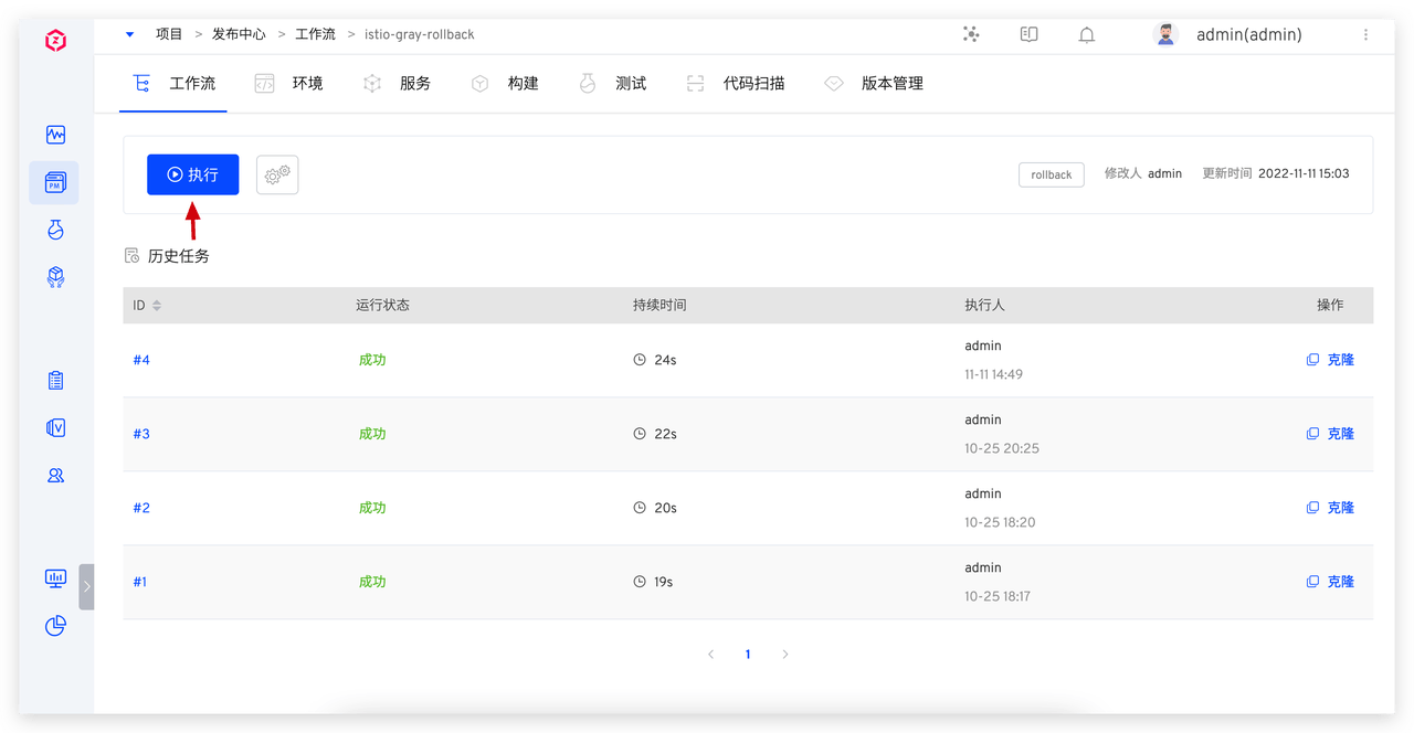 - 点击「执行」按钮,选择需要回滚的容器。