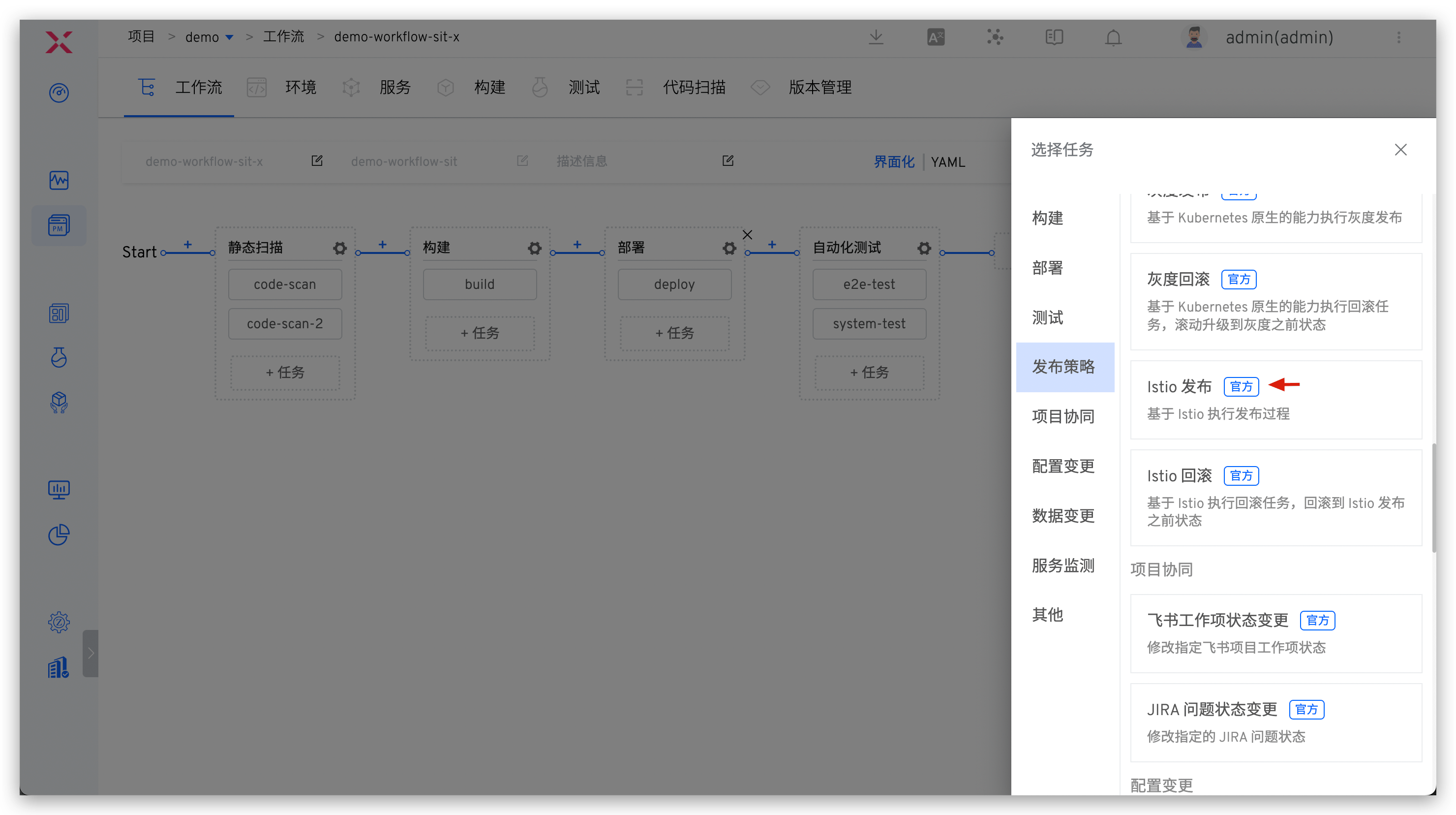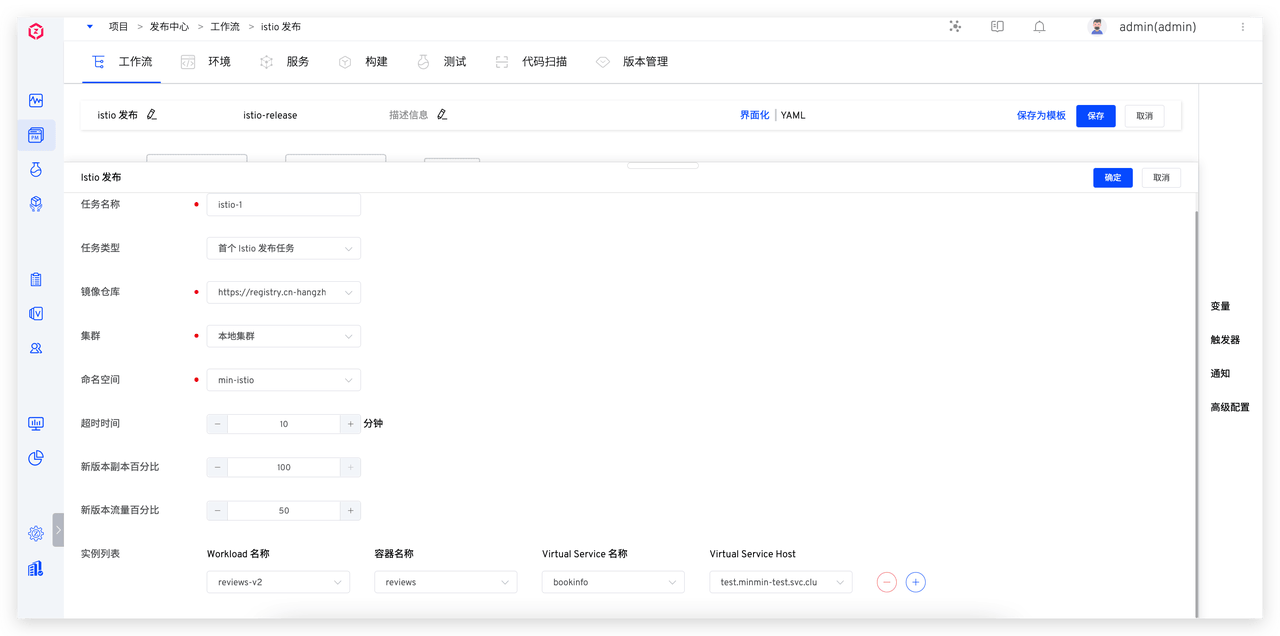 - 编辑工作流,添加「Istio 发布」任务:点击「+ 任务」,选择「Istio 发布」任务并配置