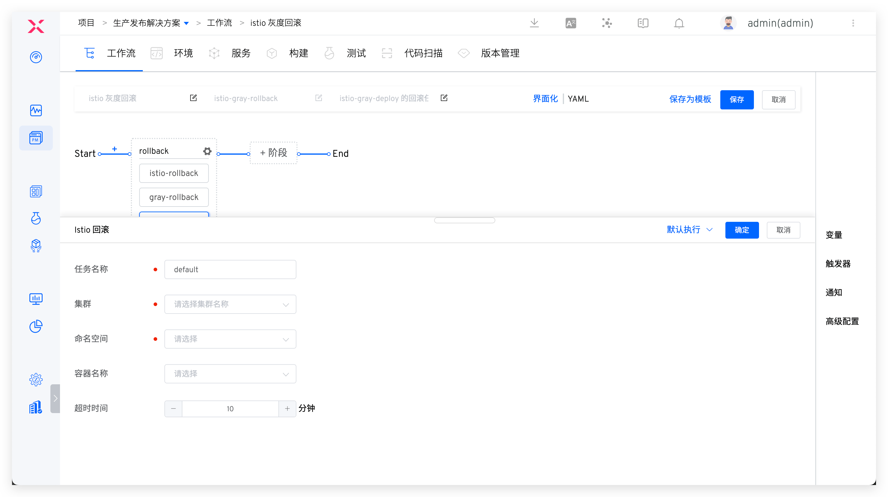 集群:待回滚的服务所在的集群命名空间:待回滚的服务所在的命名空间容器名称:只可选择 istio 发布过的容器超时时间(分钟):回滚任务超时时间