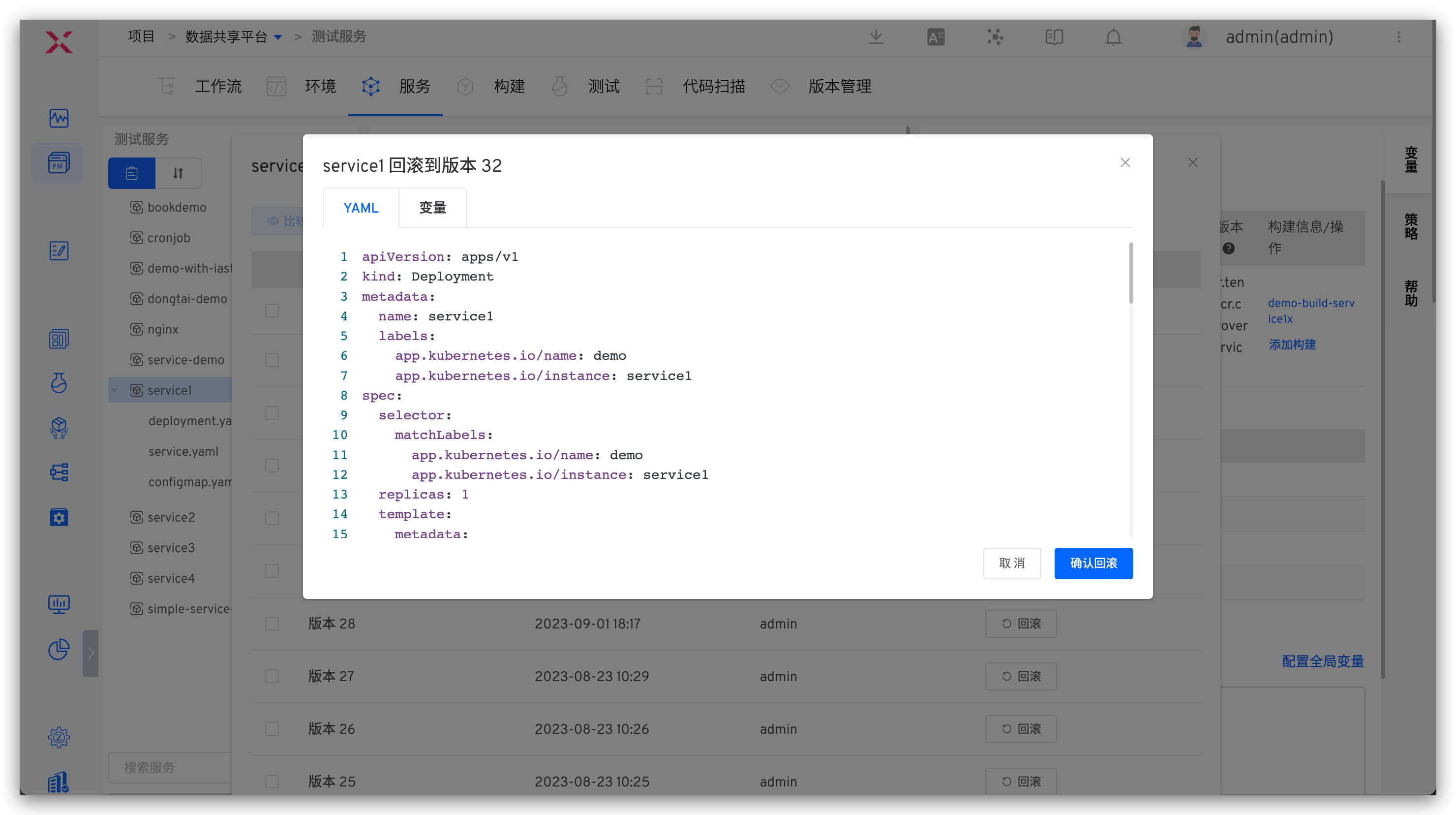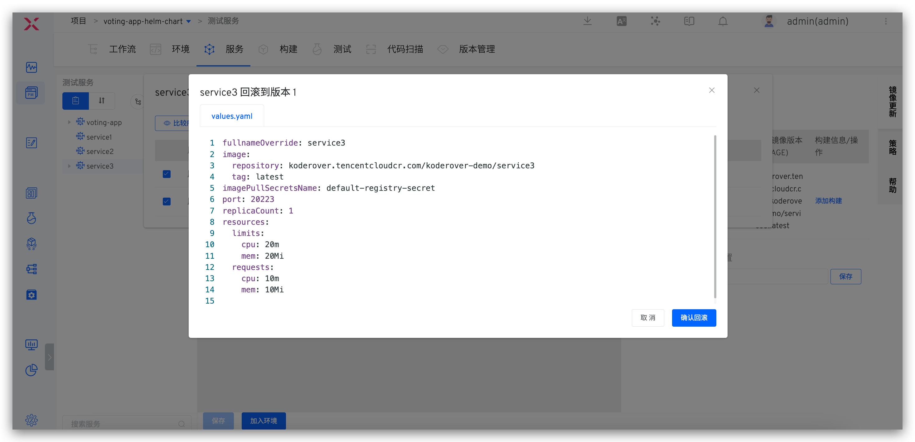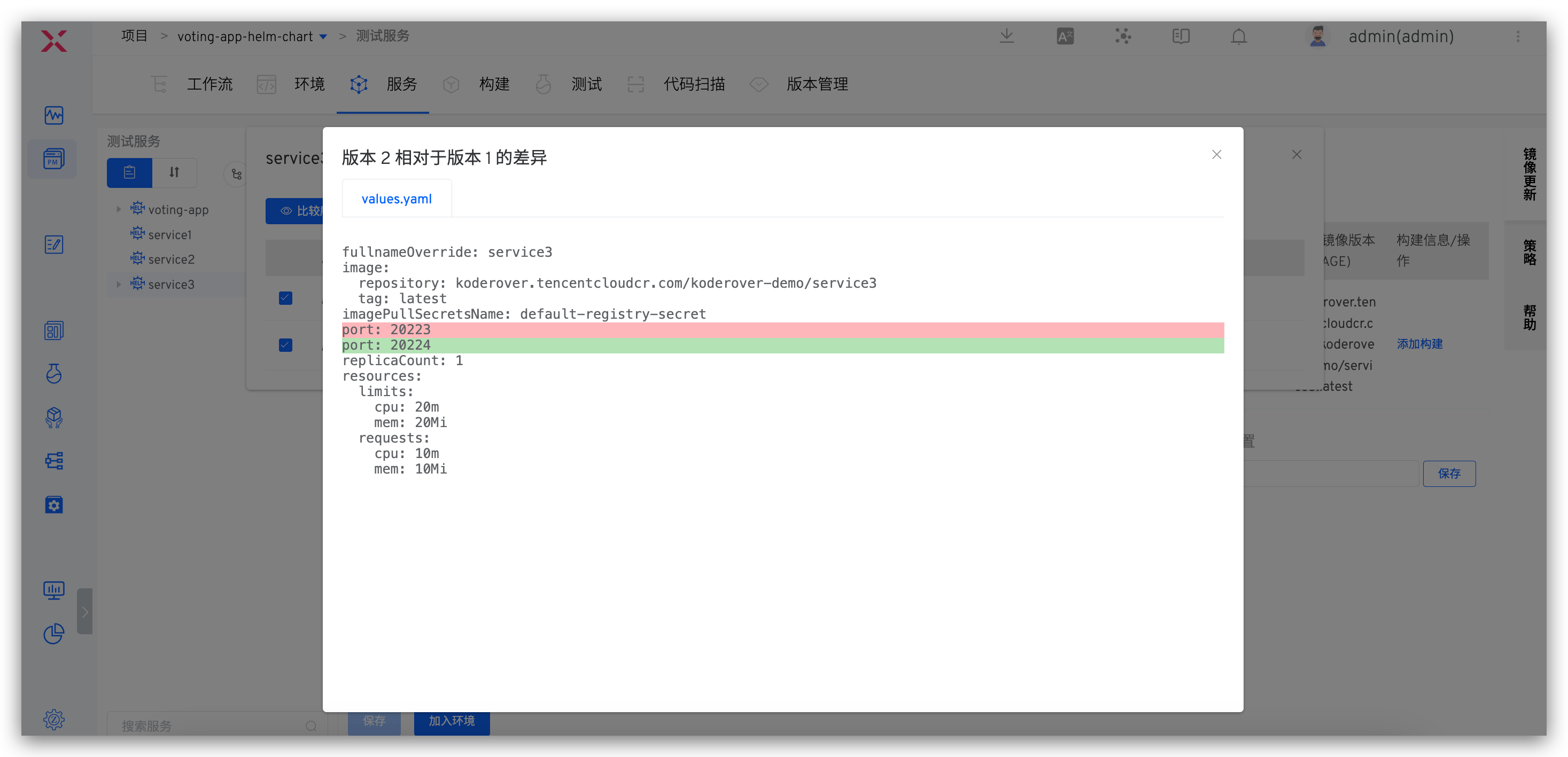 支持比较不同版本的 values文件的差异,支持一键回滚服务到指定版本。