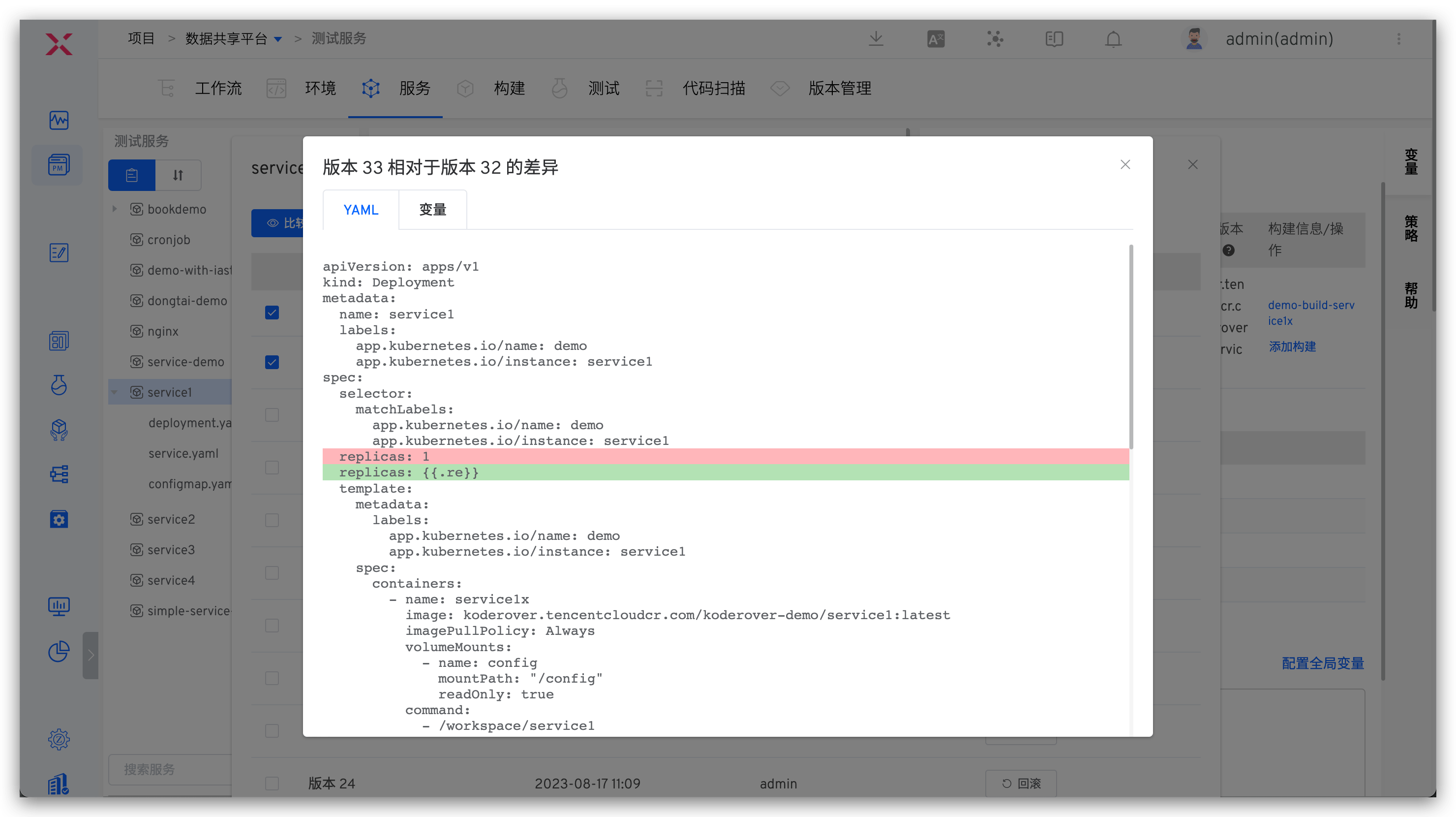 支持比较不同版本的服务差异,支持一键回滚服务到指定版本。
