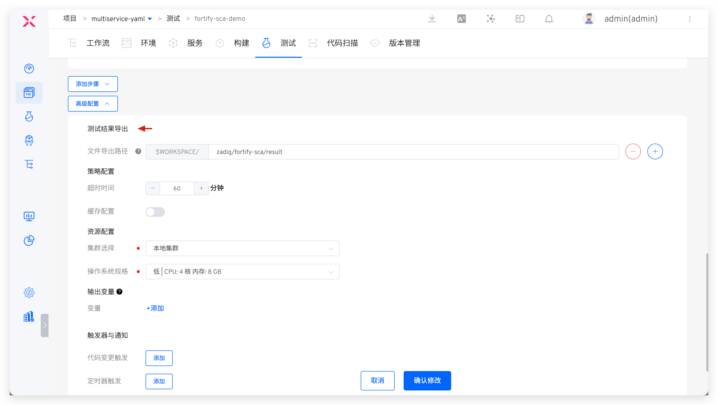 操作系统:第一步中添加的自定义镜像测试脚本:执行代码扫描的具体命令,可参考 Fortify SCA 官方文档测试结果导出:配置扫描结果所在的路径