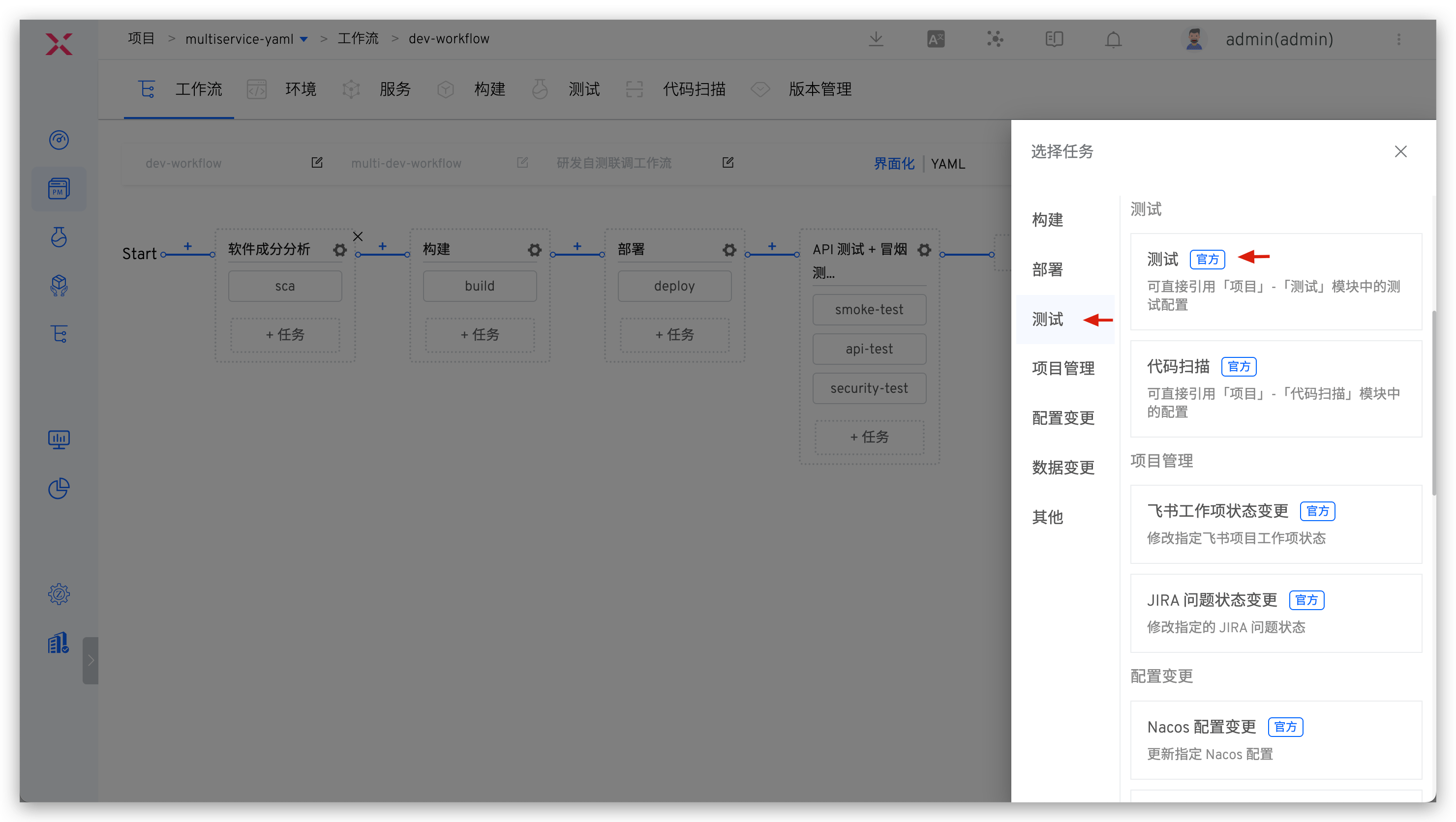编辑工作流,按需在指定阶段(如:构建任务之前)添加代码扫描任务,参考 配置工作流。