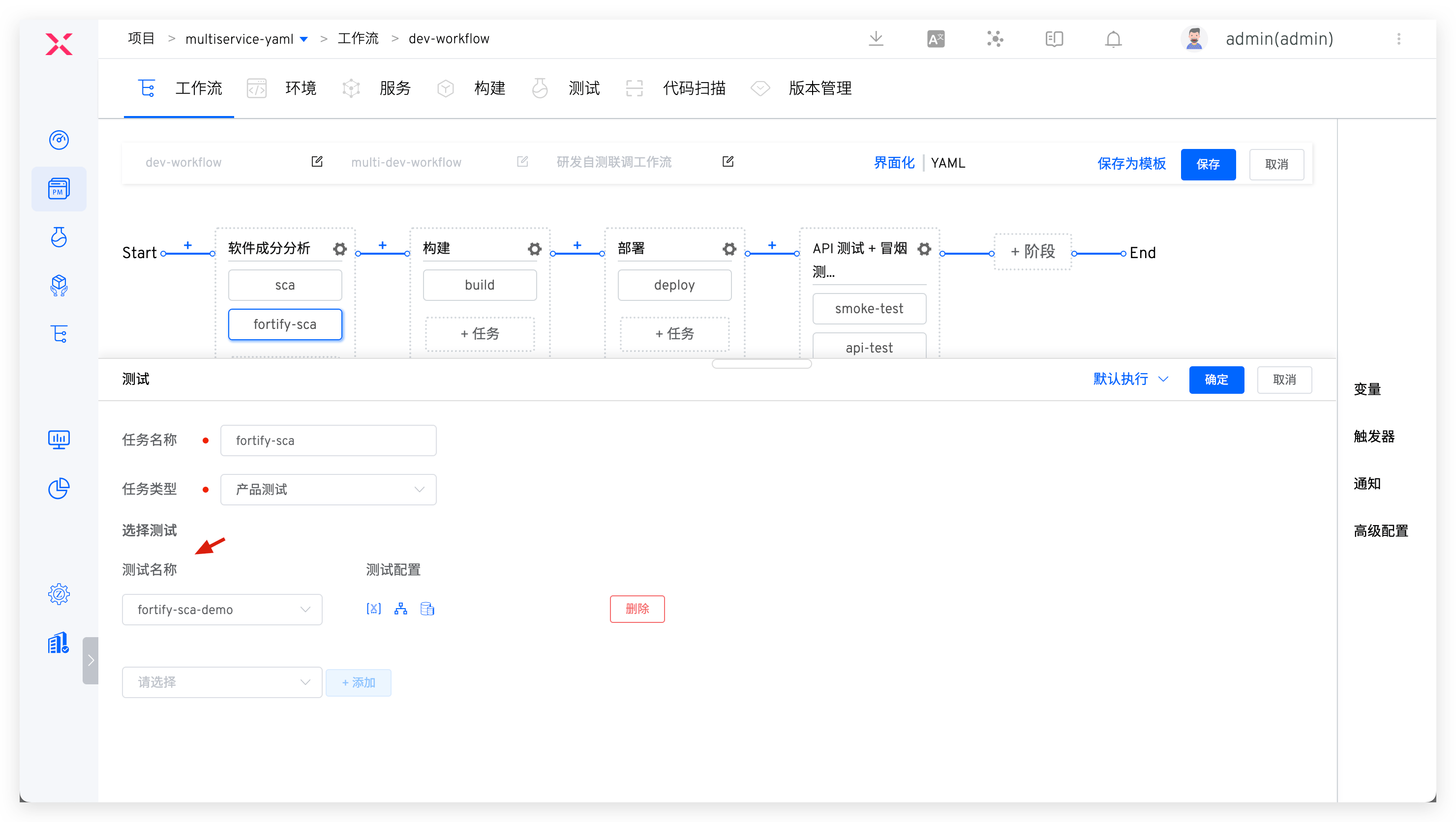 流程包含:静态扫描(开启质量门禁) > 构建 > 部署 > 自动化测试(业务测试 + 动态安全检测)